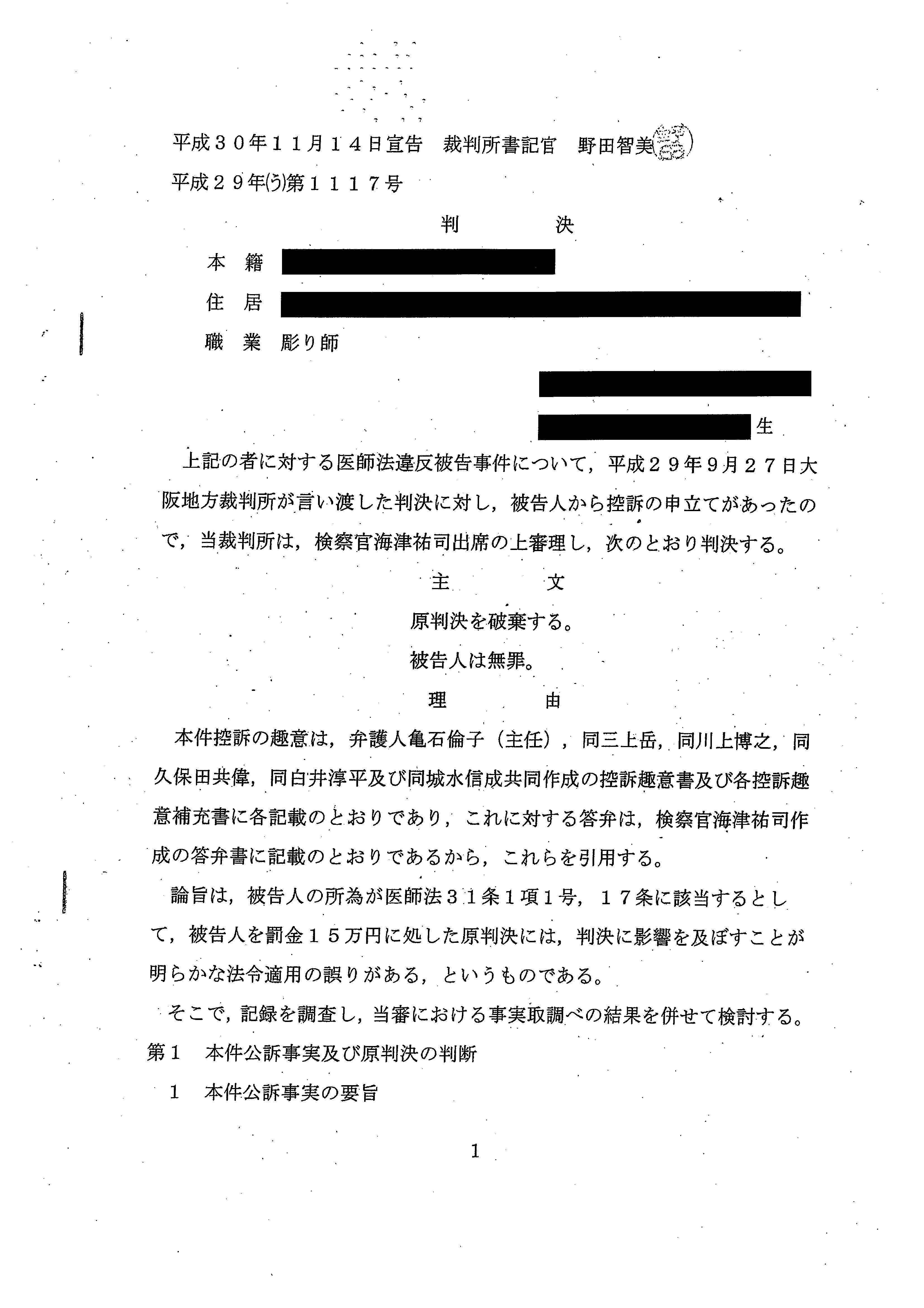 クラウドファンディングを通じて「タトゥー裁判をあきらめない!」にご支援くださったみなさま、昨日、大阪高等裁判所でタトゥー裁判(彫り師医師法違反被告事件)の控訴審の公判が開かれ、多数の傍聴希望者が抽選となるなか、満席の大法廷(202号法廷)で、判決が言い渡されました。