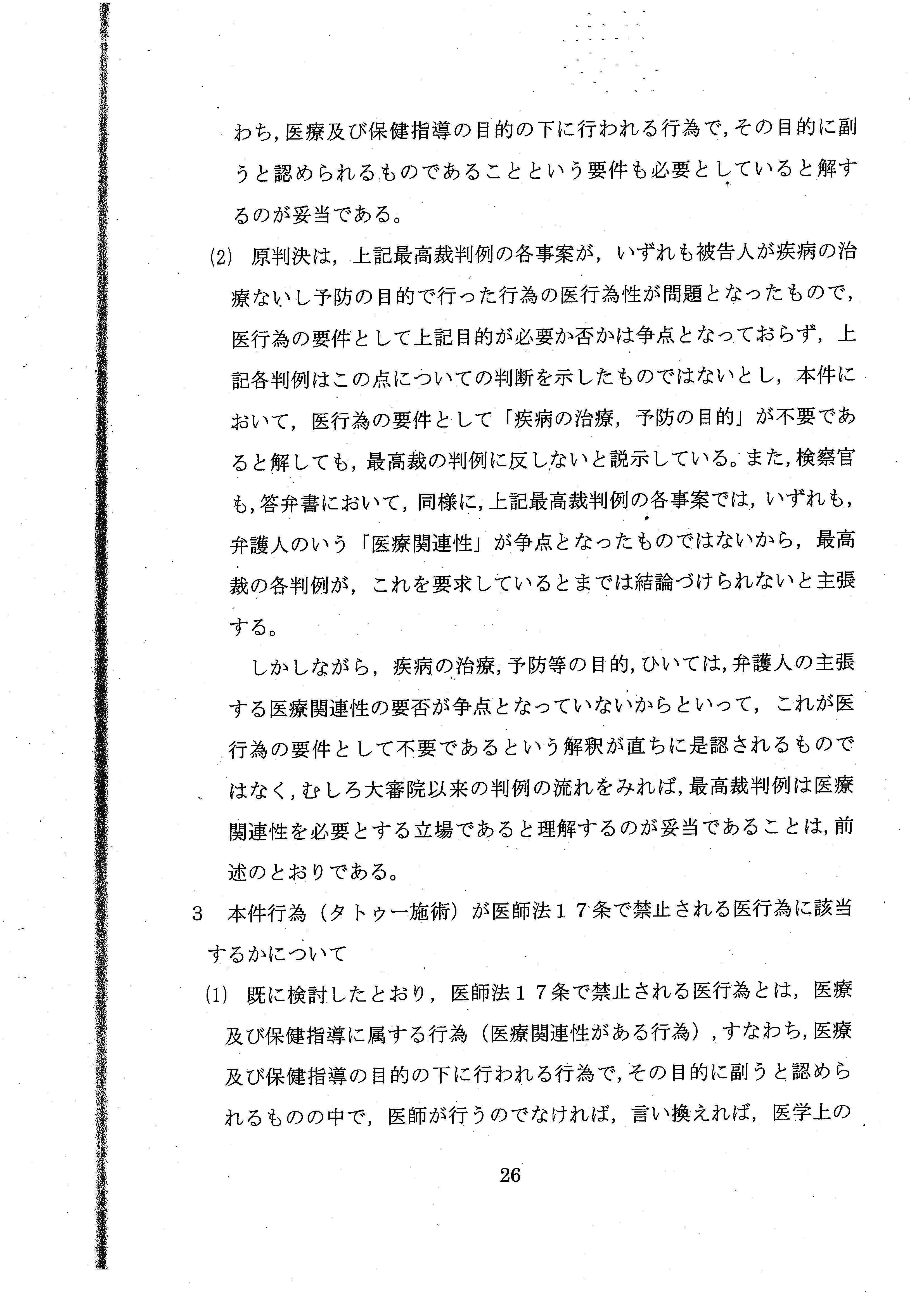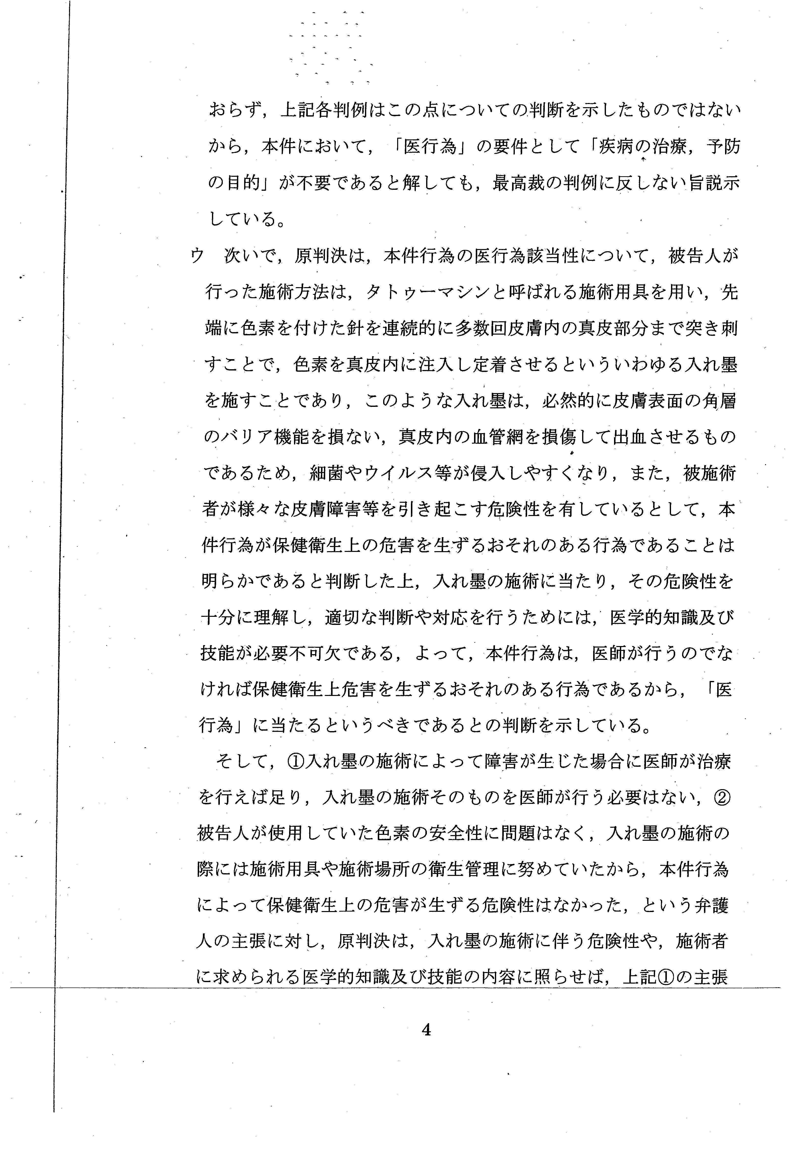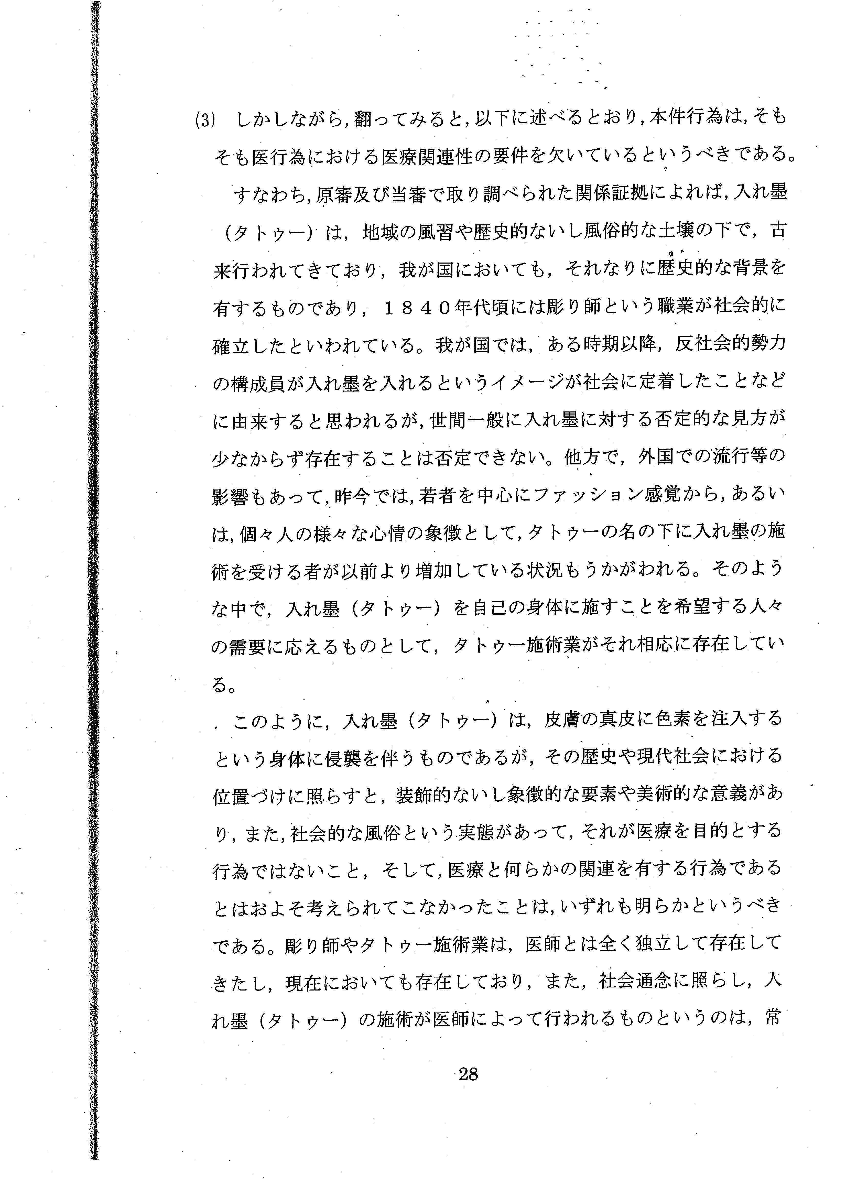 「彫り師やタトゥー施術業は、医師とはまったく独立して存在してきたし、現在においても存在しており、社会通念に照らし、タトゥーの施術が医師によって行われるものというのは、常識的にも考え難い」