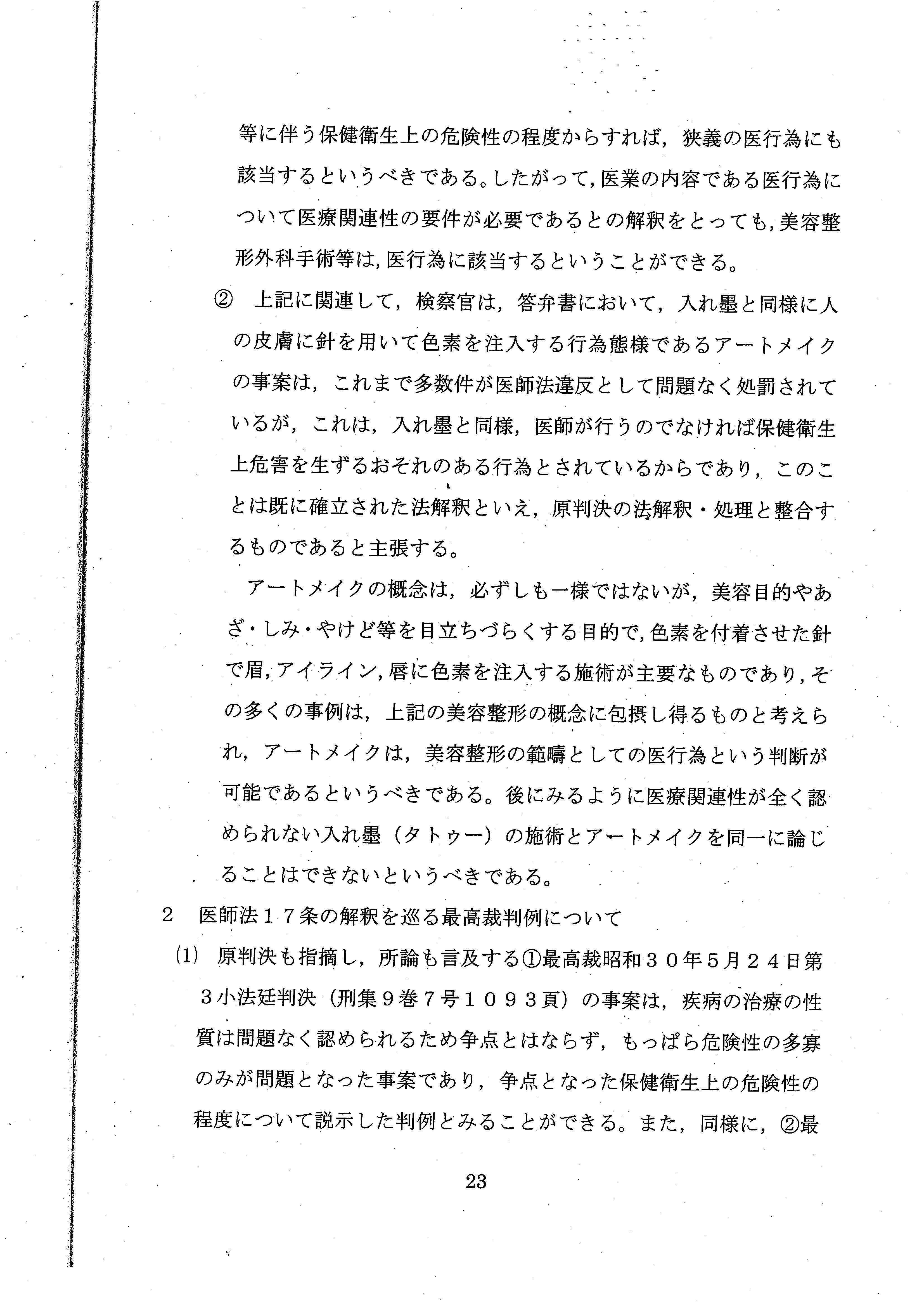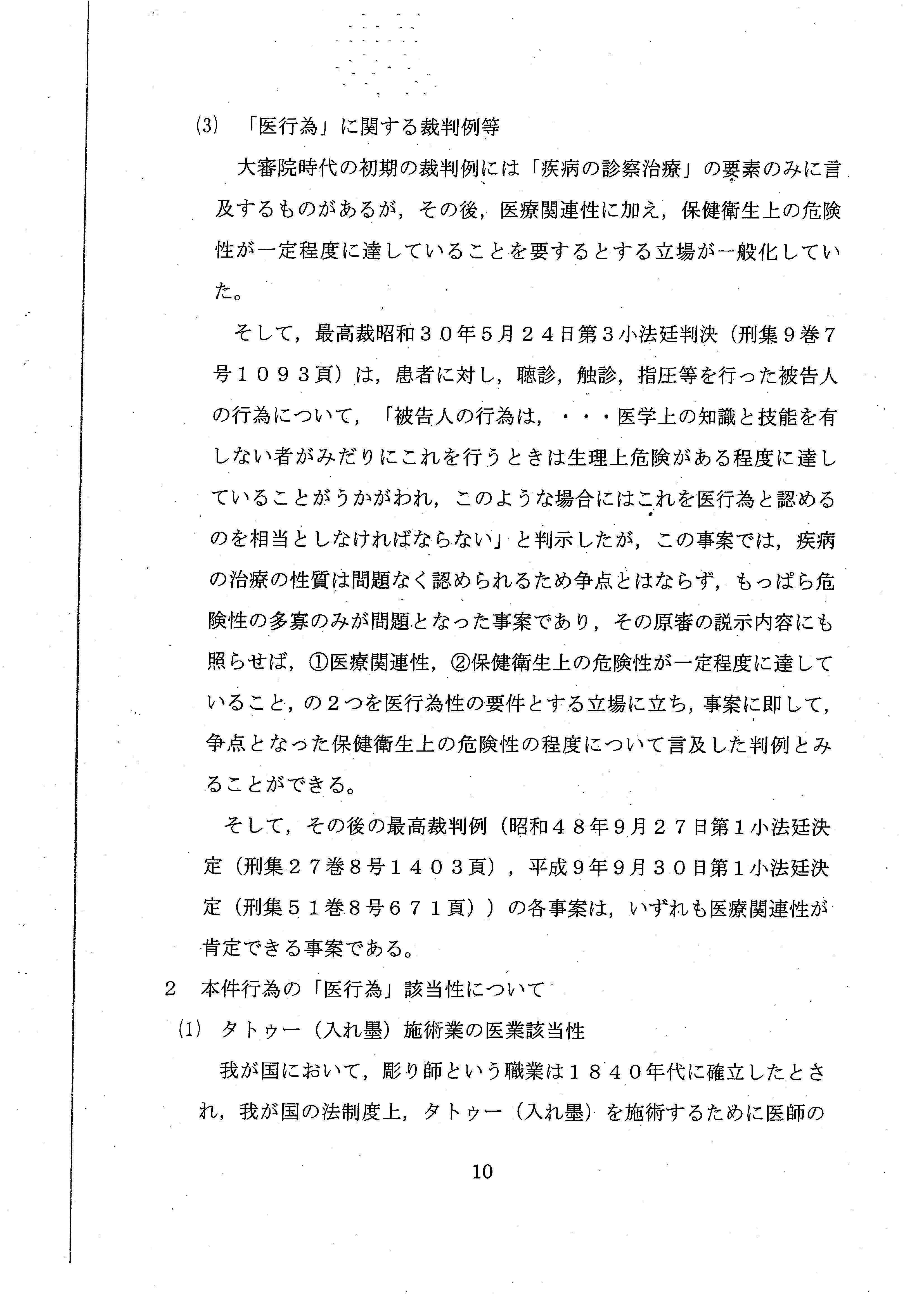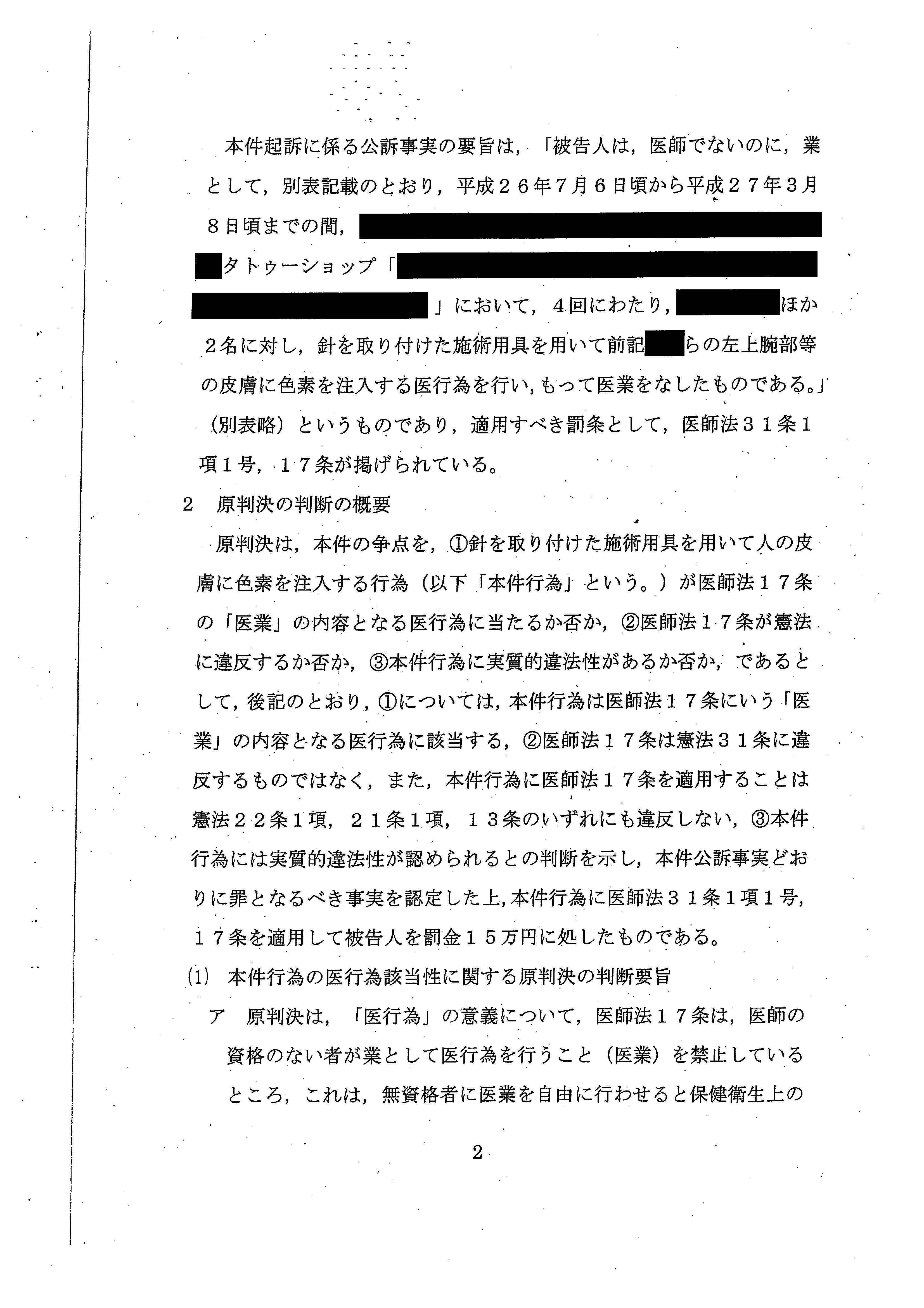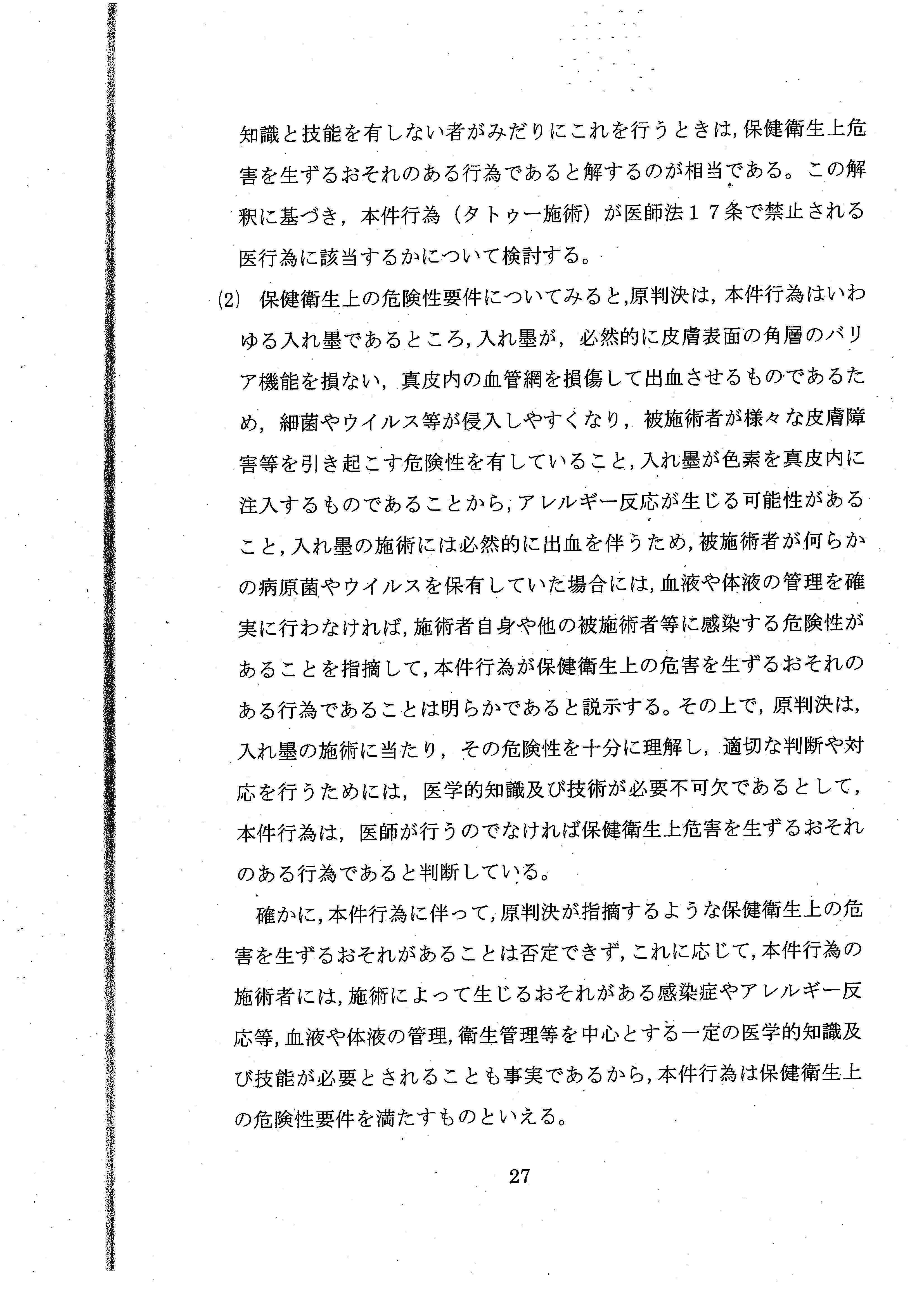 「彫り師やタトゥー施術業は、医師とはまったく独立して存在してきたし、現在においても存在しており、社会通念に照らし、タトゥーの施術が医師によって行われるものというのは、常識的にも考え難い」