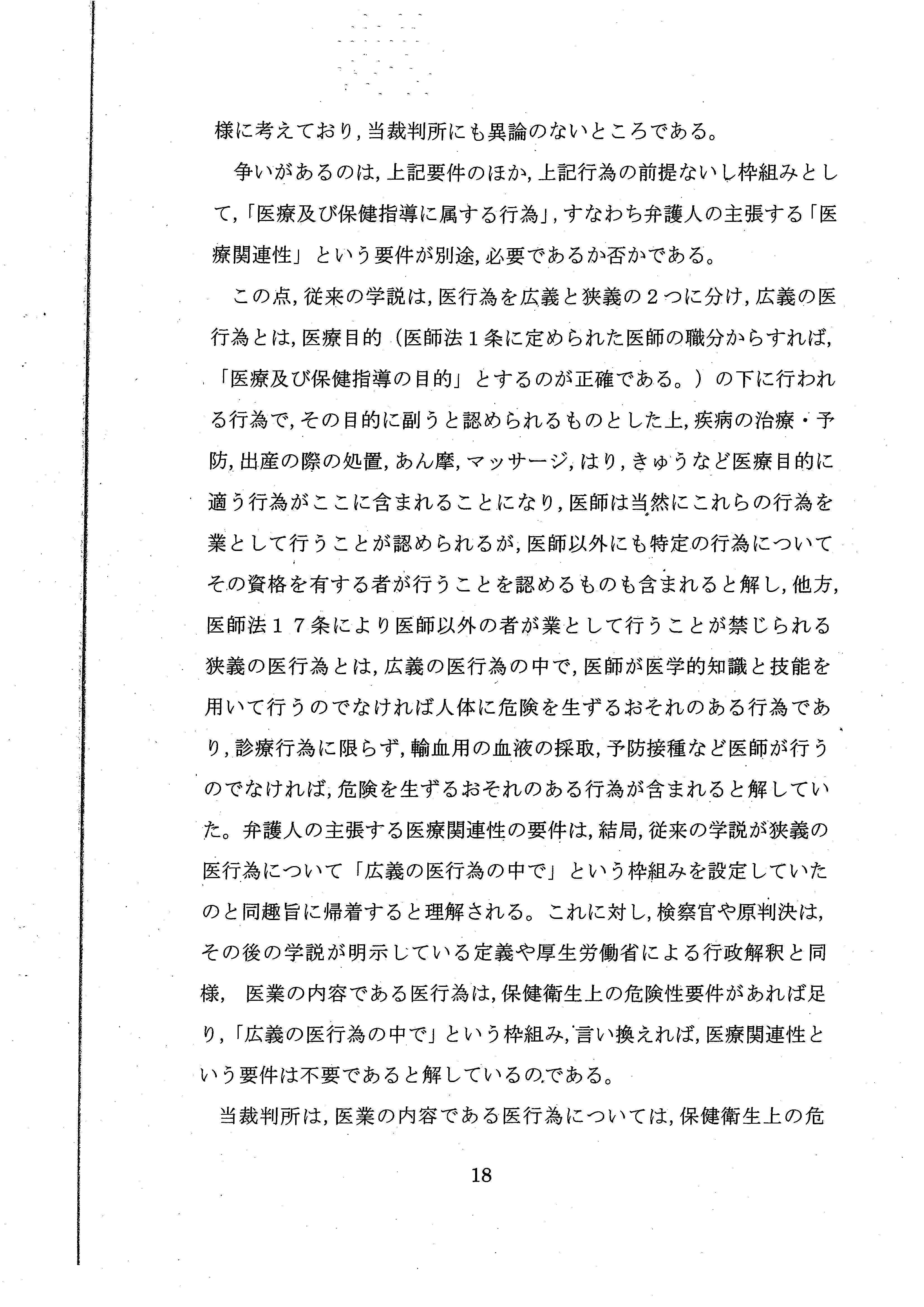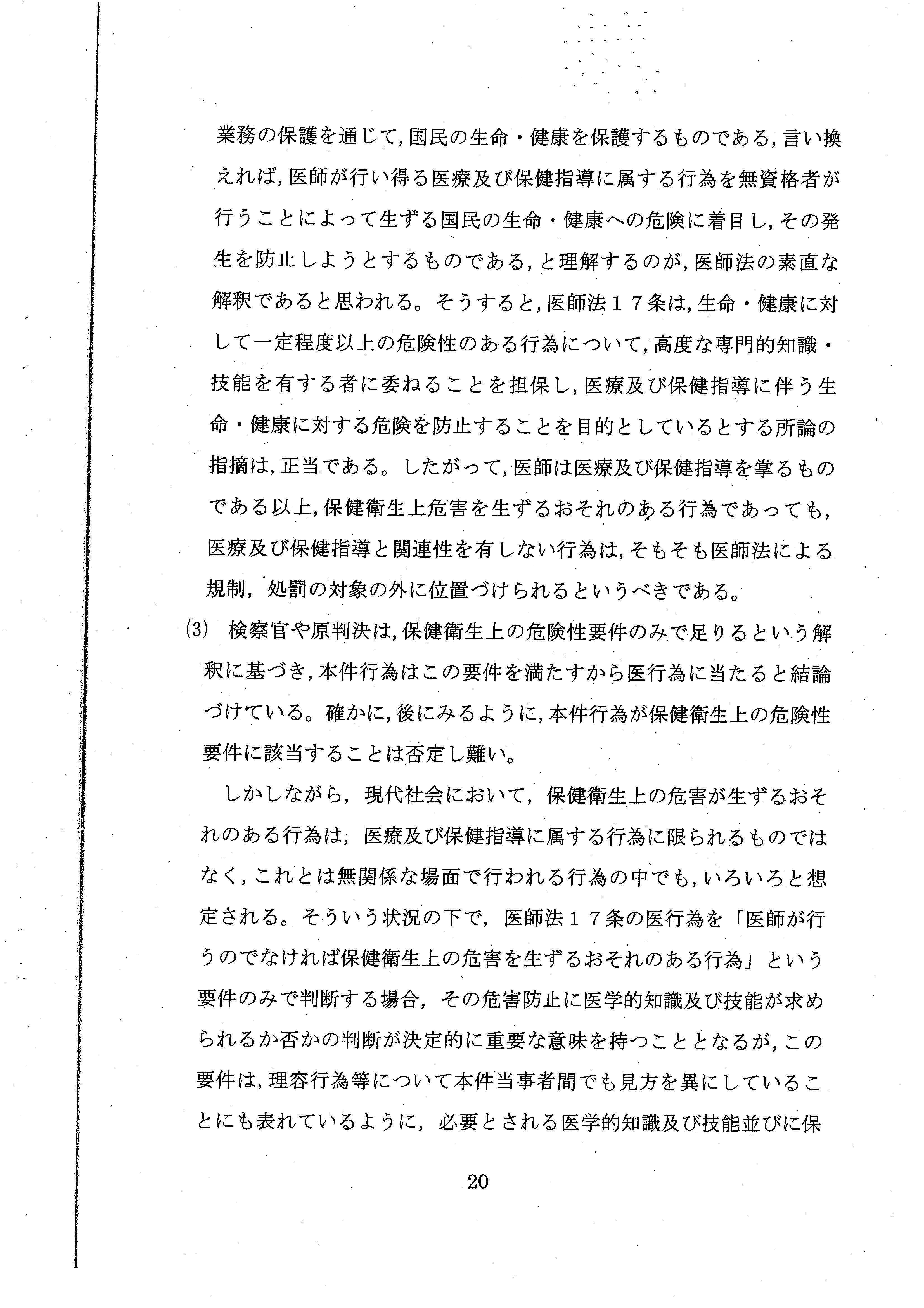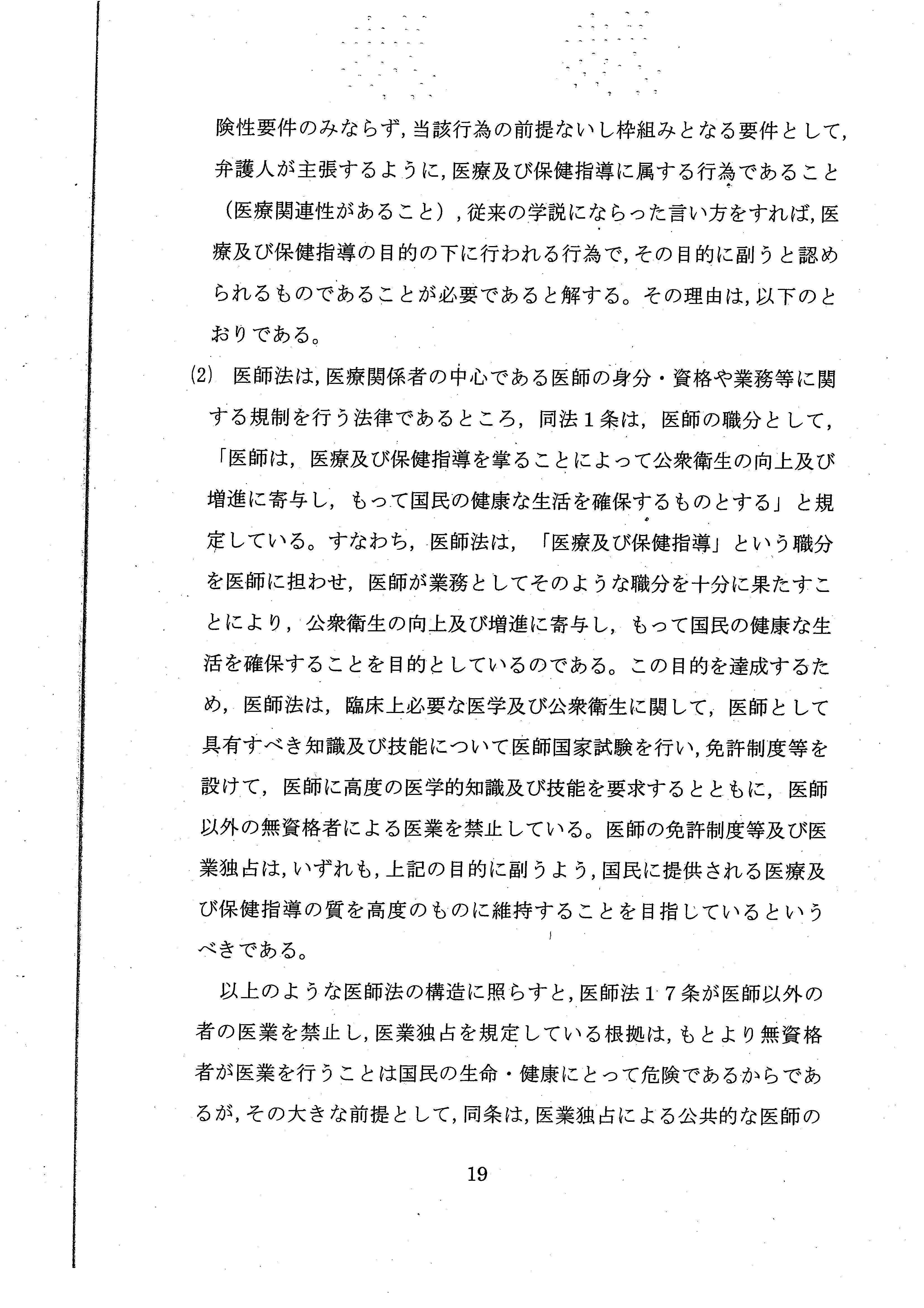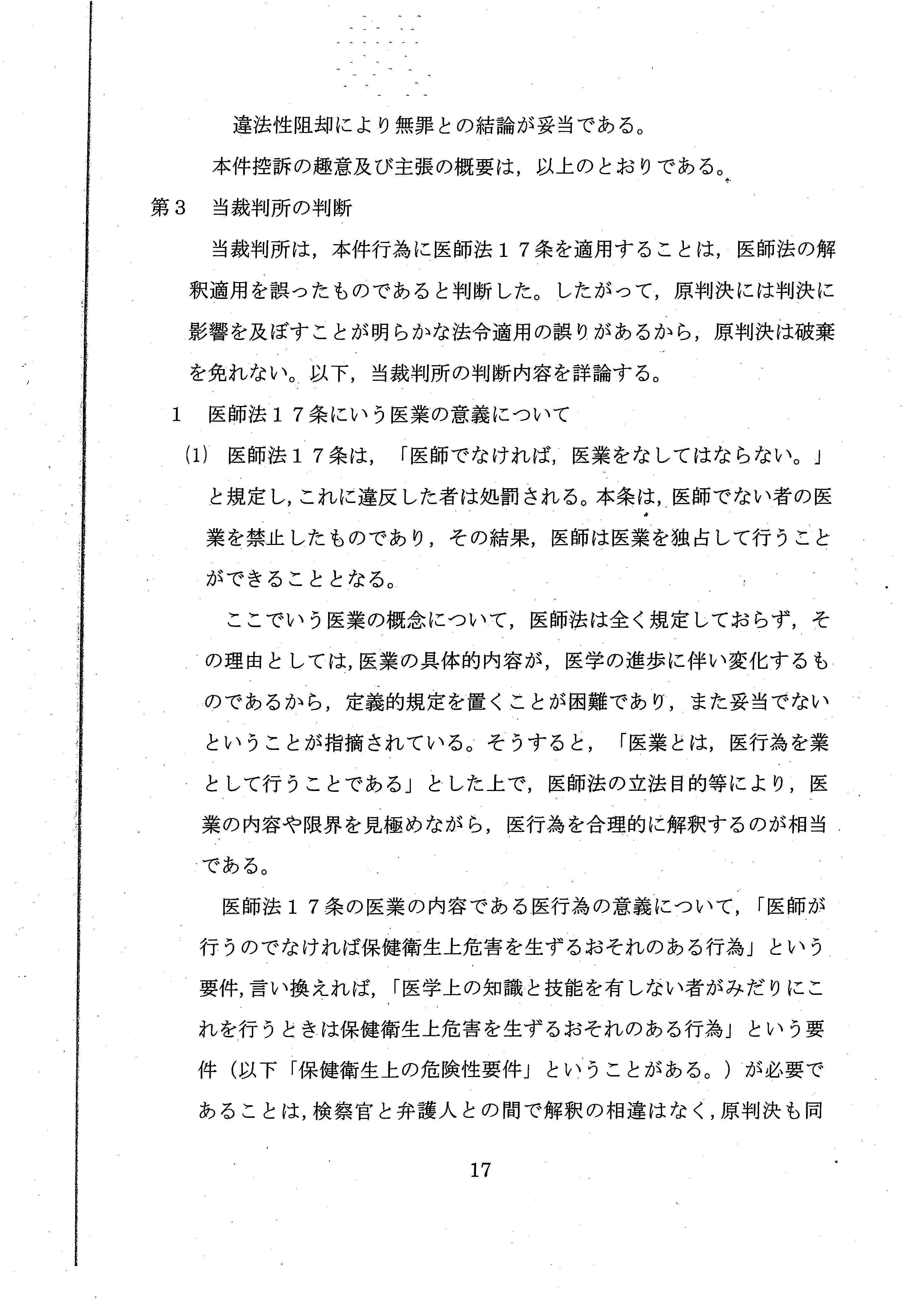 医師法17条の解釈だけで結論を出すことができたにもかかわらず、あえて、憲法上の職業選択の自由について言及しており、実質的な「違憲判決」といえるような内容でした。