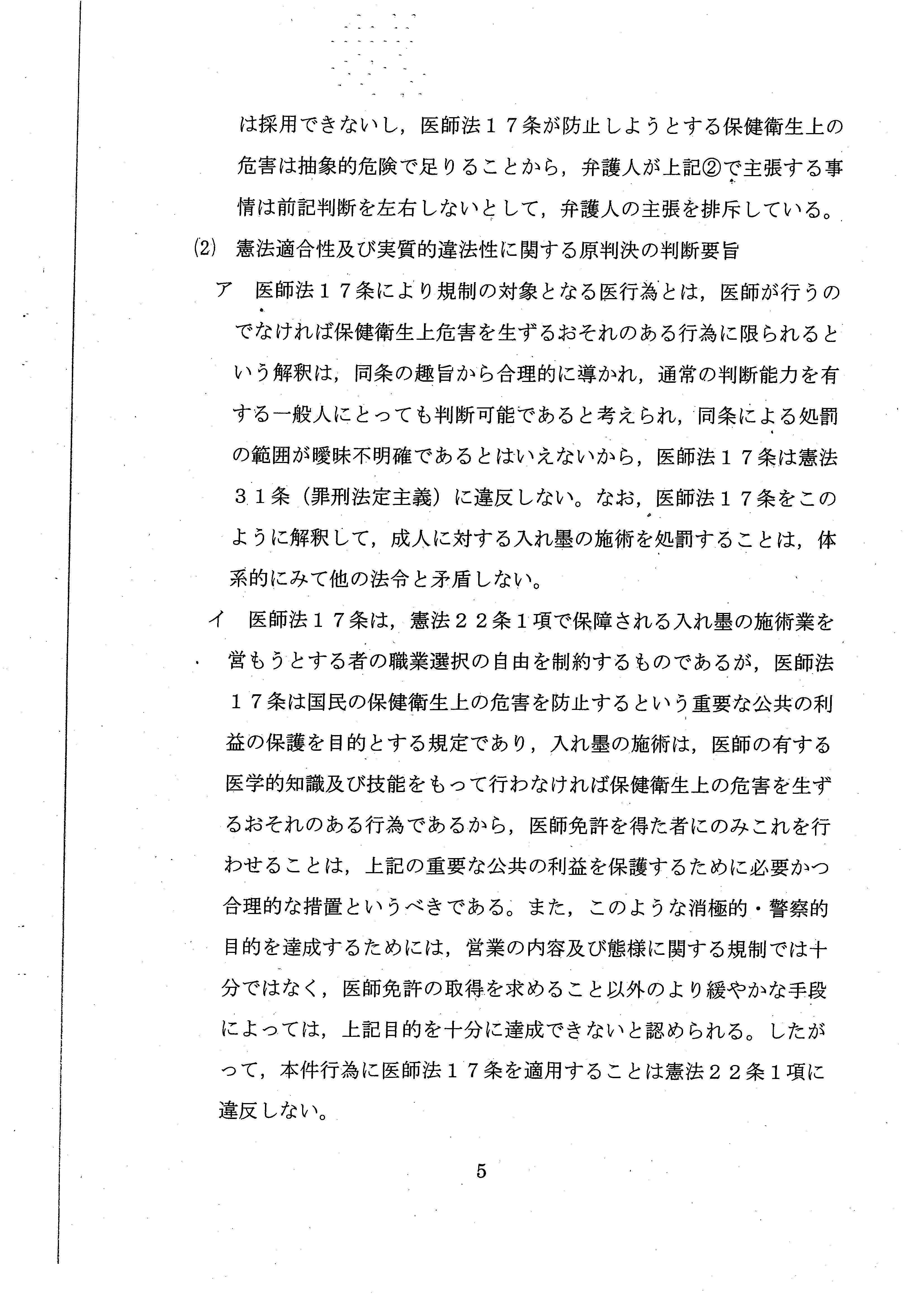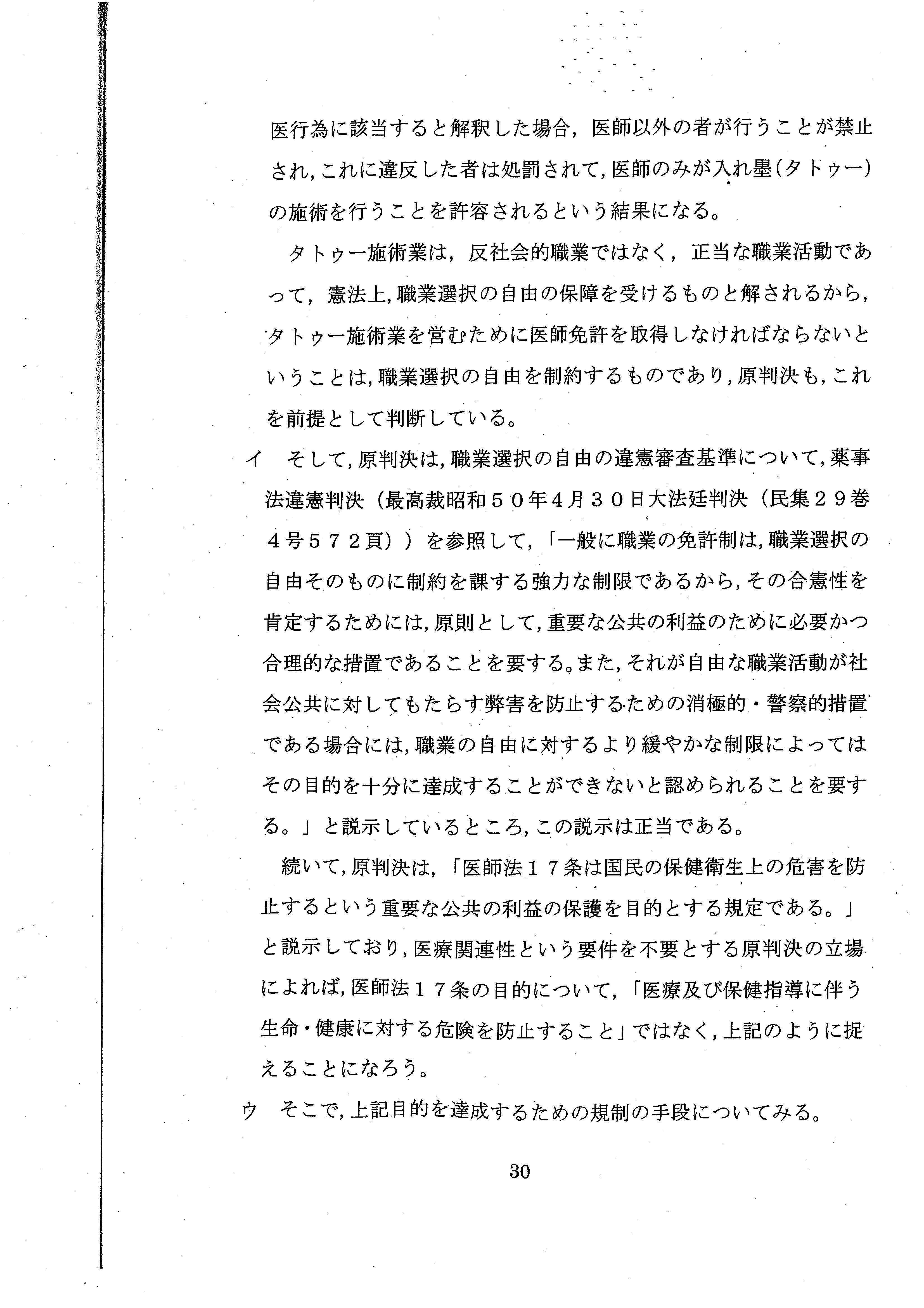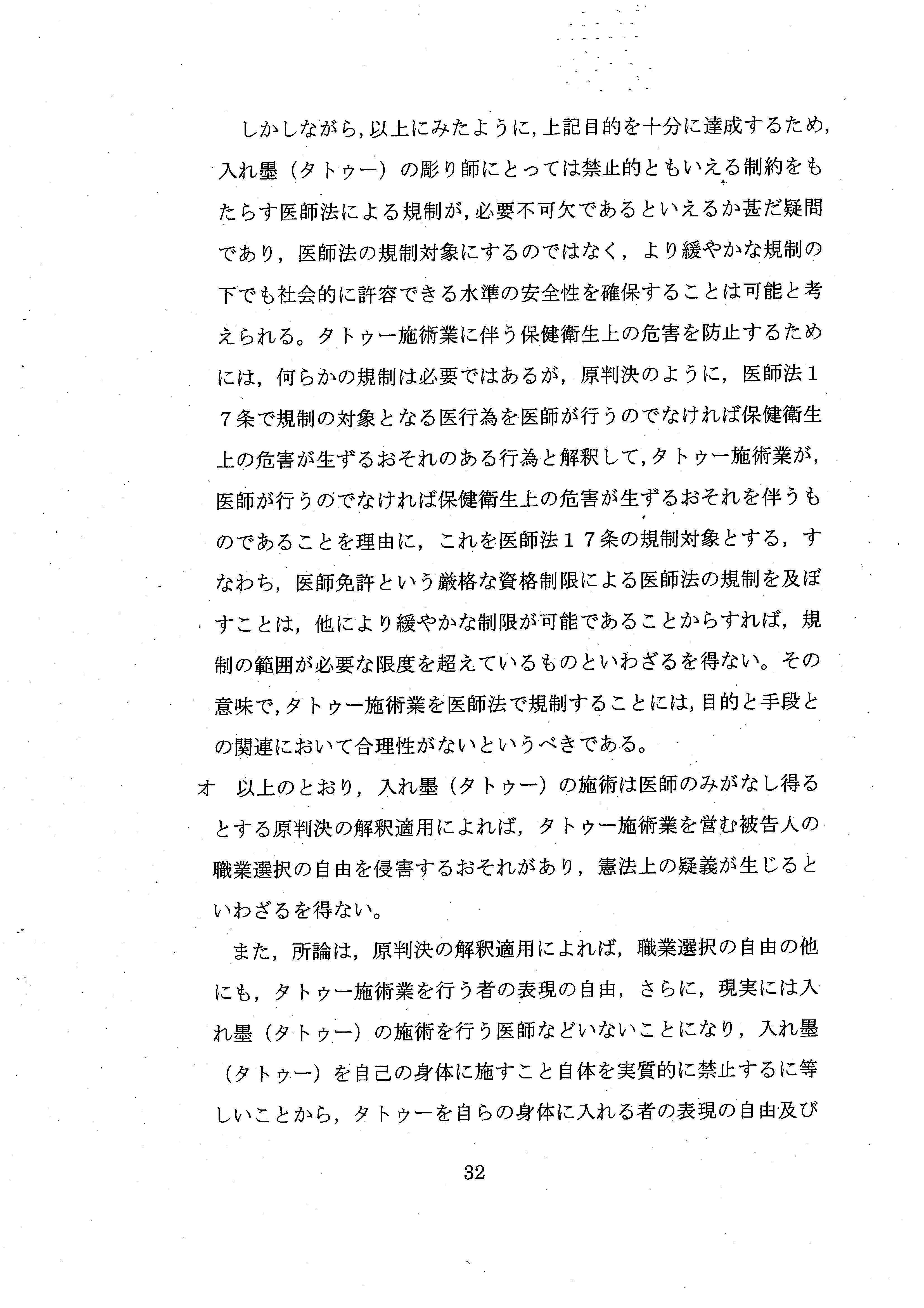 「タトゥー施術業は反社会的職業ではなく、正当な職業活動であって、憲法上、職業選択の自由の保障を受けるものと解される」