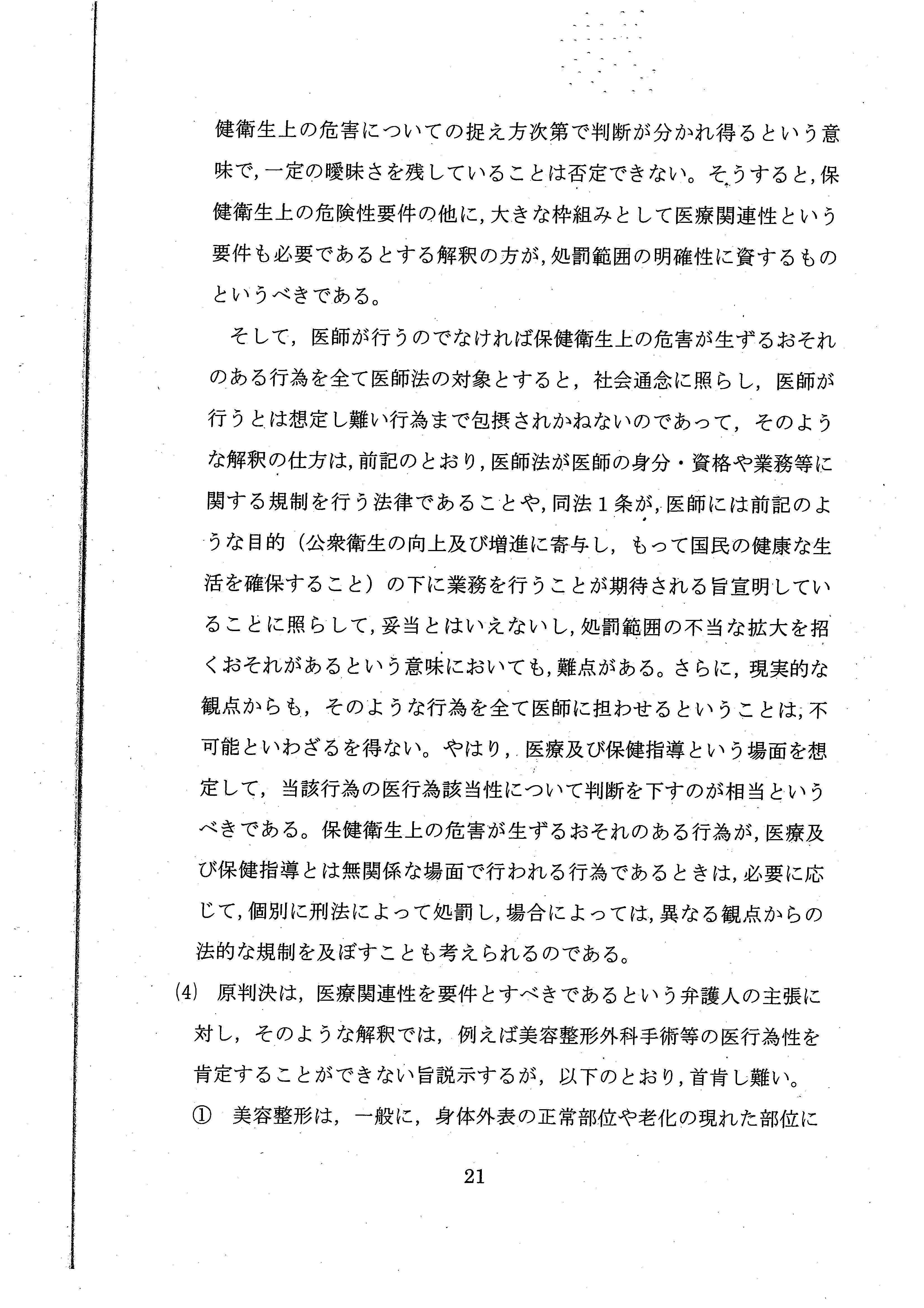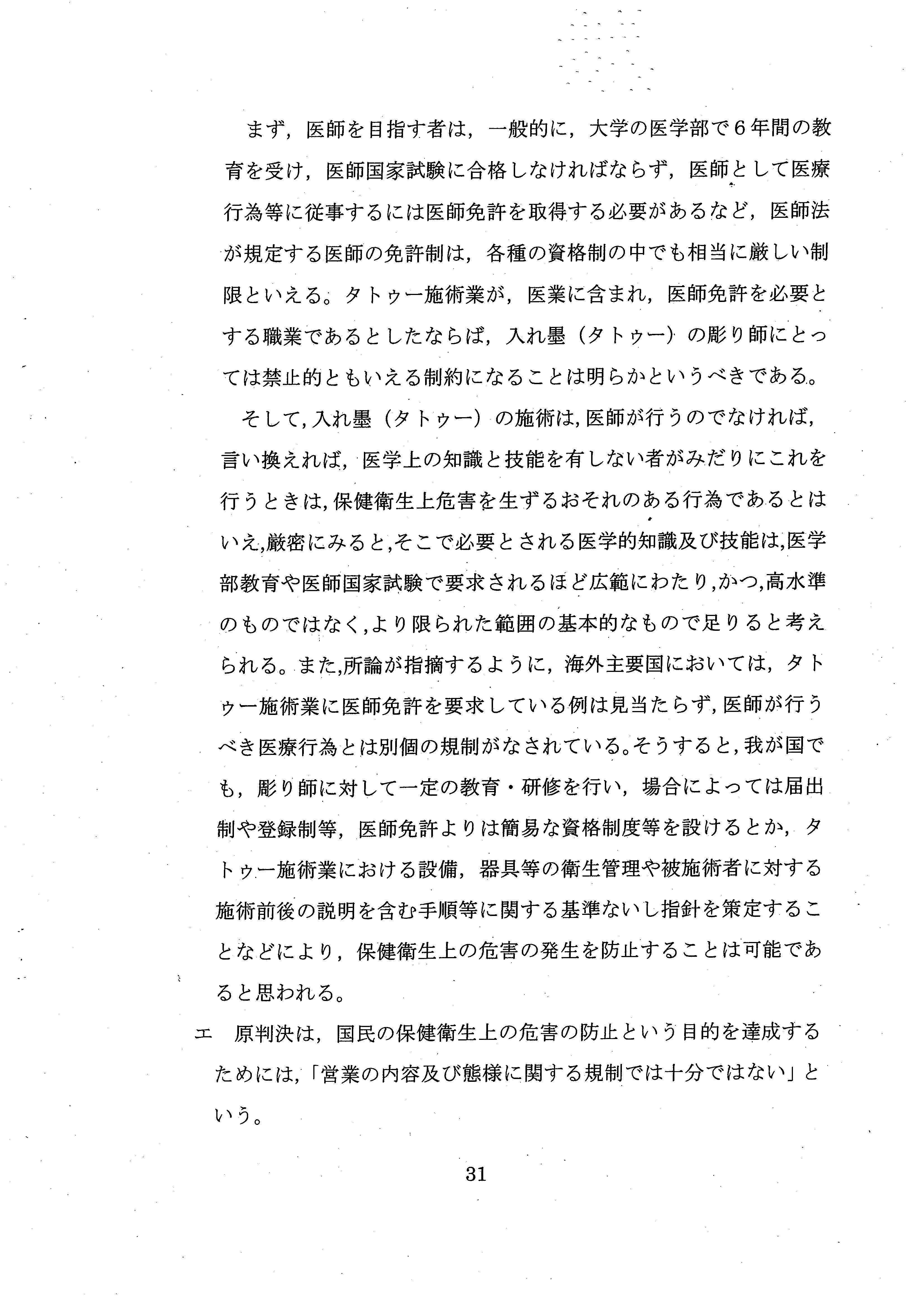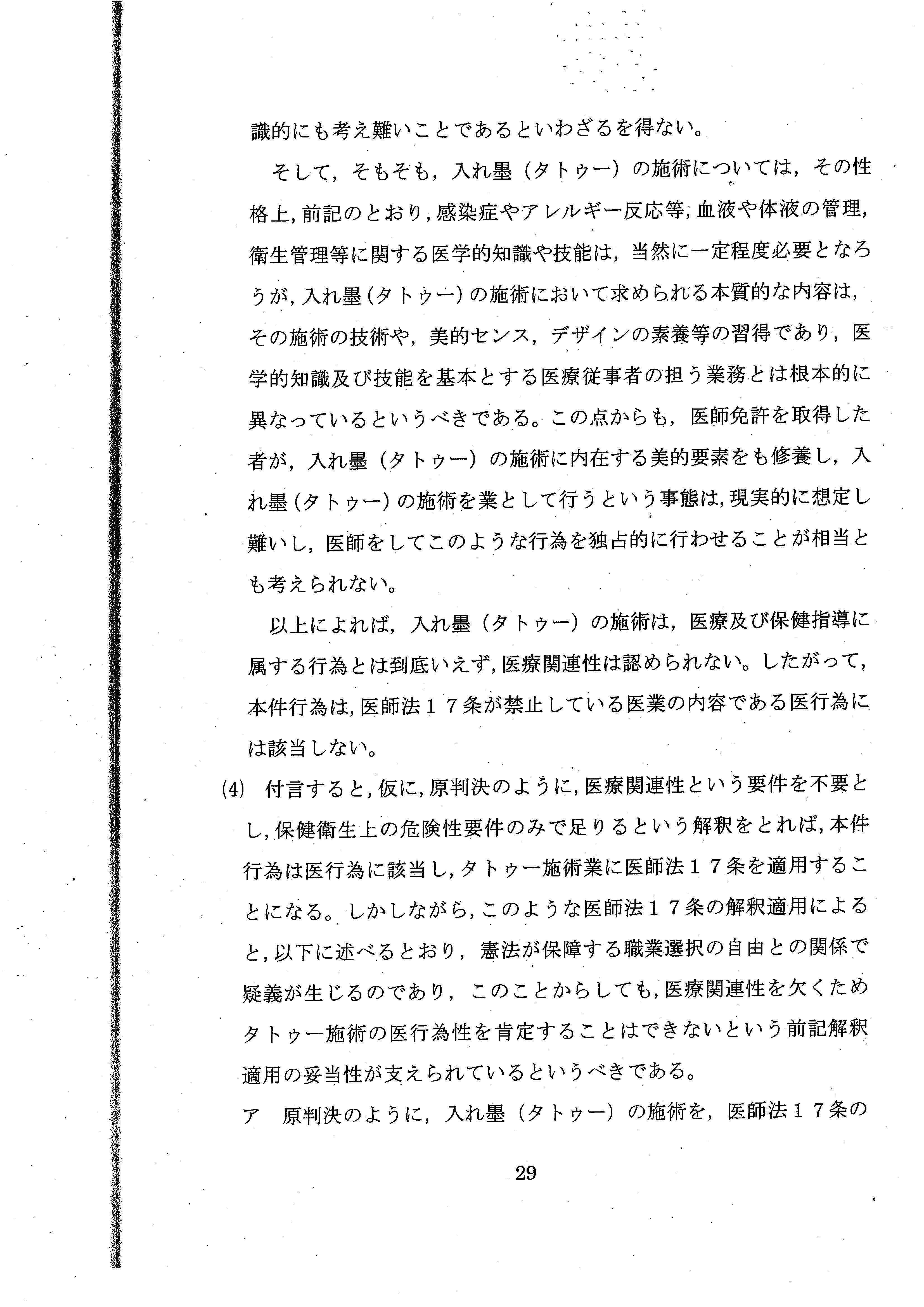 「医師免許を取得した者が、タトゥーの施術に内在する美的要素をも習得し、タトゥーの施術を業として行うという事態は現実的に想定し難いし、医師をしてこのような行為を独占的に行わせることが相当とも考えられない」