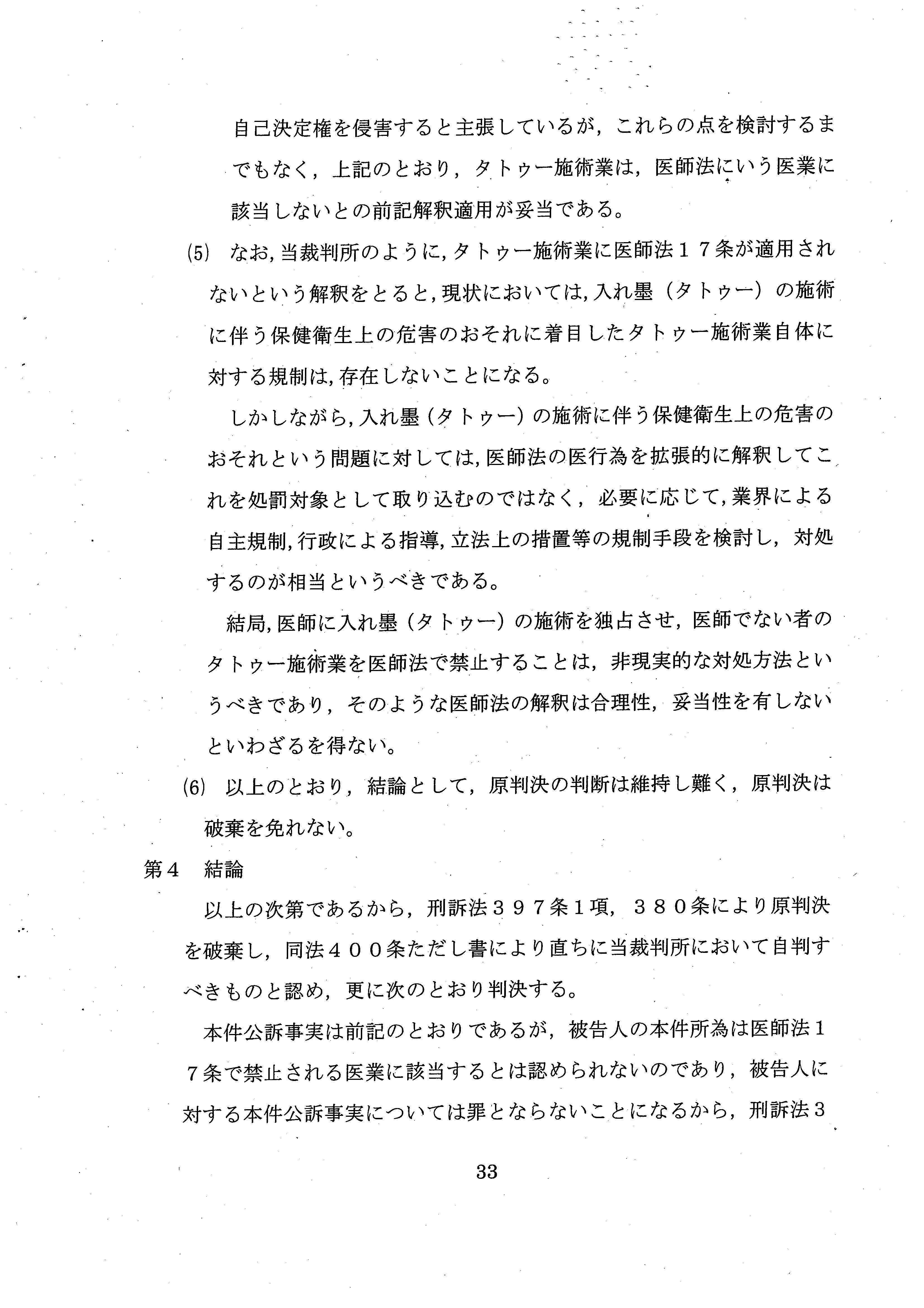 ③よって、一審の判断は破棄を免れない。被告人のタトゥー施術行為は罪とならないことになるから、無罪の言い渡しをする。