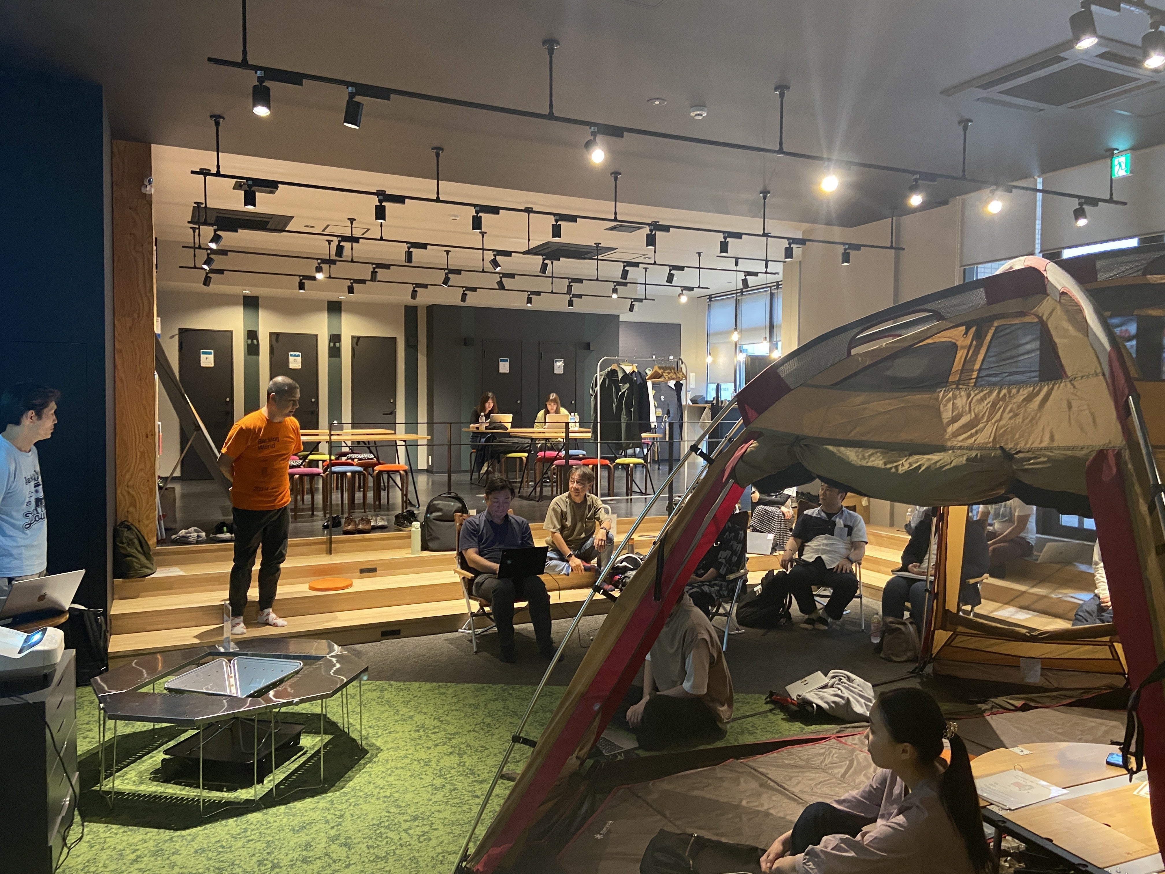 JBUGさんには、コミュニティースペースをレンタルしていただきました。テントや焚き火台が設置されているスペースで、参加者の方は座りたいところに座るという形でイベントを実施しました。このスペースは土足厳禁で提供しております。ゆったりとしたイベントを実施するにはいいスペースとなっています。
