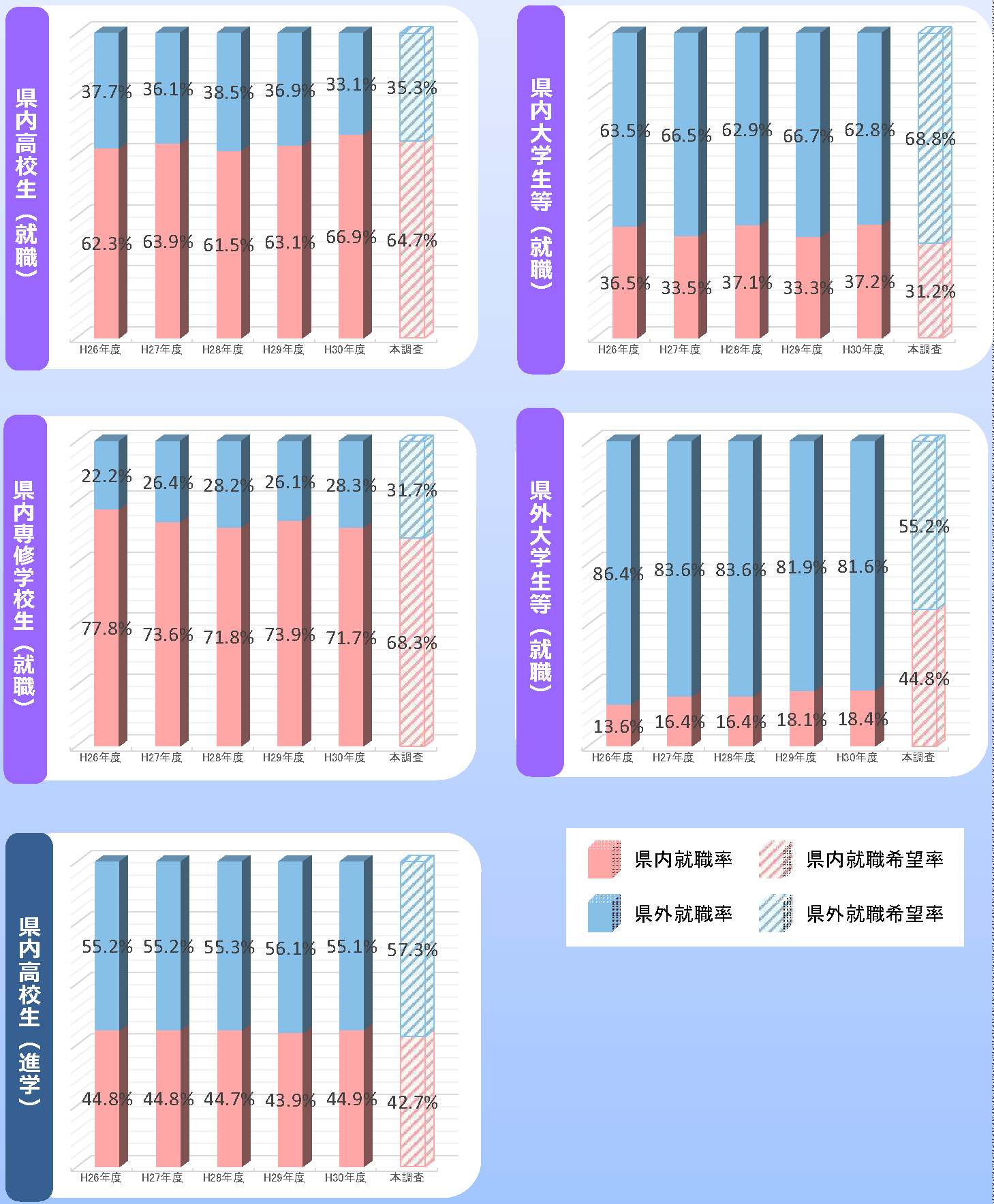 高知県の就職意識調査によると、県内の高校生や大学生の将来の就職希望率を比較した際、「県内就職希望率 < 県外就職希望率」となっています。