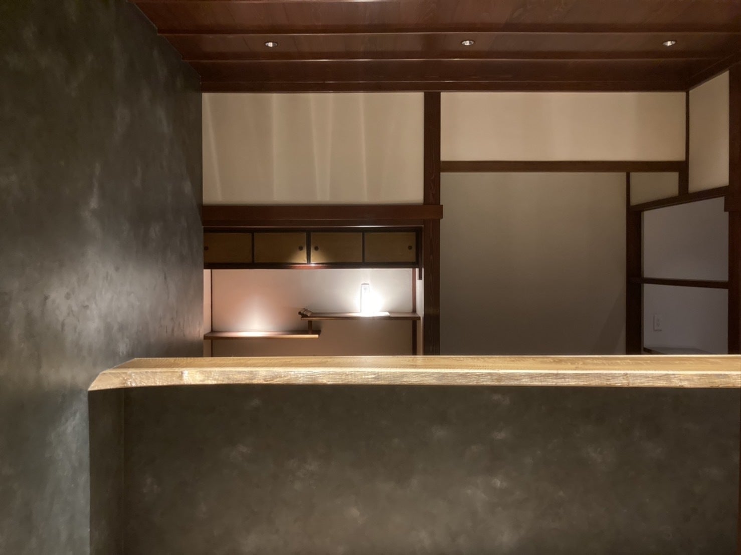 お部屋の壁を昆布色に仕上げたことで落ち着く空間になっています。