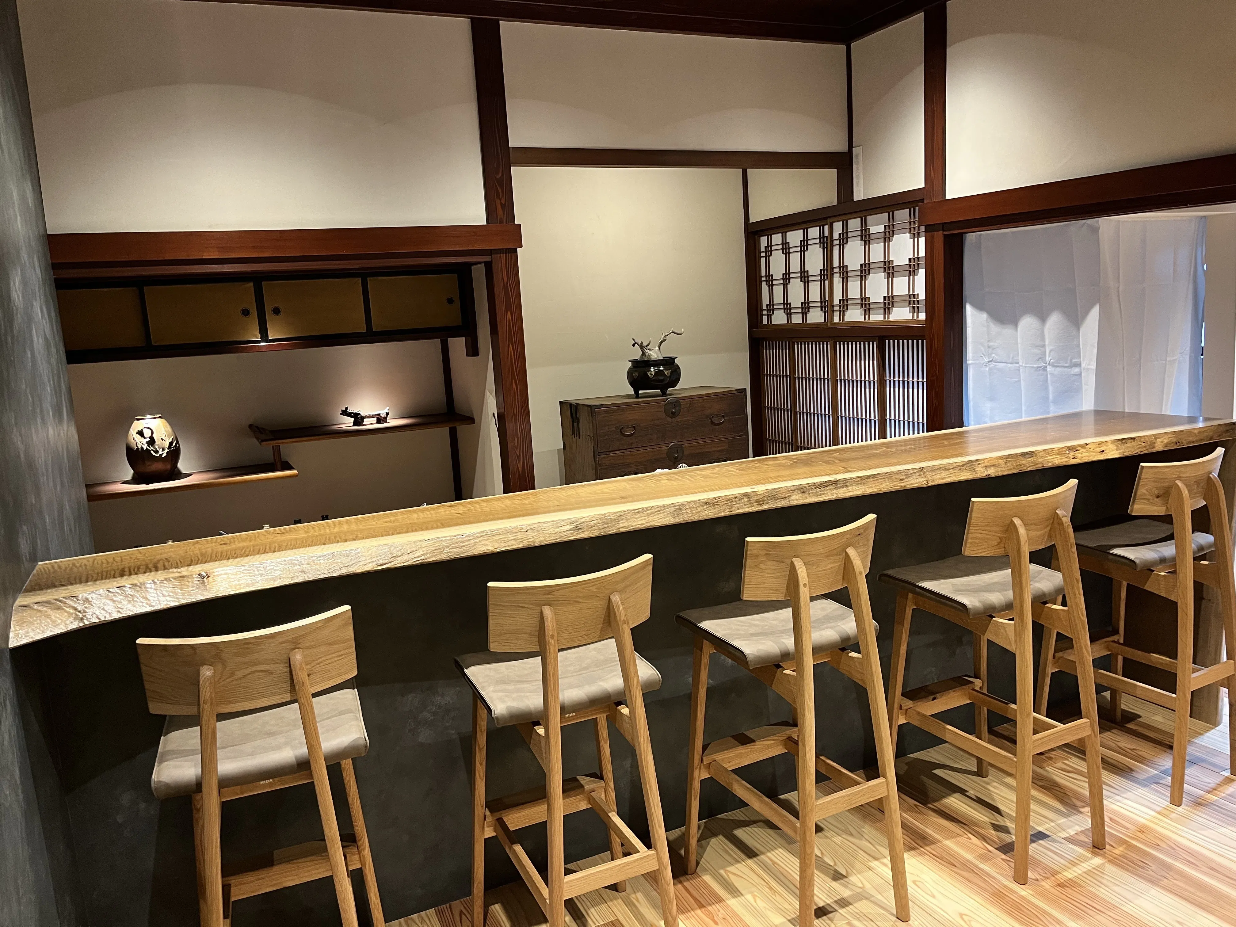 古民家をリノベーションした建物は、和室の〝しつらい〟をそのまま残し、床の間や天袋、違い棚、地袋を生かしています。