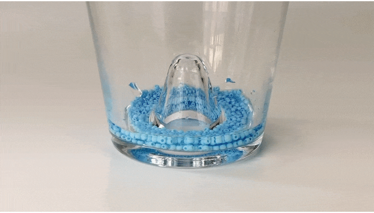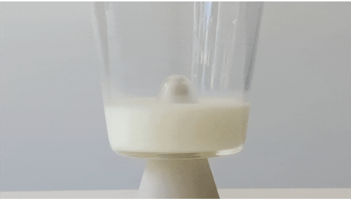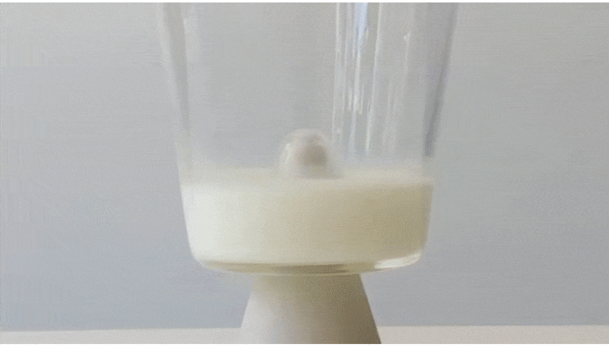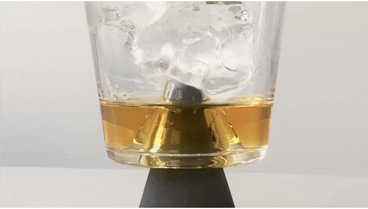 グラスの底にある突起(凸部)が、飲み物を注いだ際に対流を生み、まるで竜巻のような動きで上昇しているのがわかります。空気を取り込むことで飲み物の香りを引き立て、味のバランスを調えてくれます。炭酸で割ったり、コーヒーを牛乳で割ったりするとマドラーで混ぜなくてもいいくらい上手く混ざり美味しい仕上がりに。