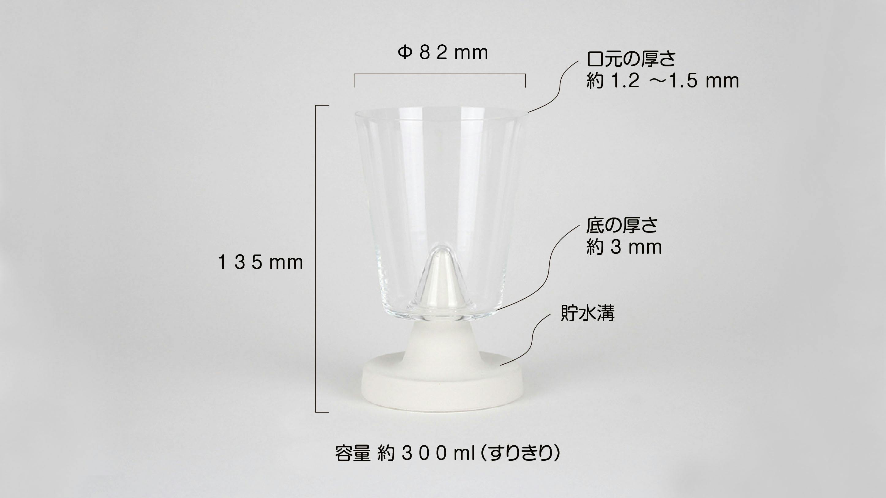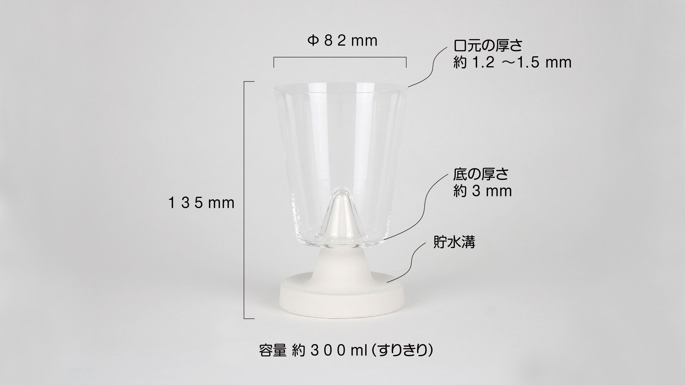 ①口元の厚さは1.2〜1.5mm程度と薄く口当りが良い。②容量は約300ml、飲物の種類に関わらず使いやすい容量。③口径が大きく香りを広げ大きな氷も入って便利。④グラスの底にかけて厚みを設け安定感と耐久性を実現。⑤コースターを付けても安定感がある倒れにくい設計。⑥コースターの周囲には「貯水溝」があり多少溢れても大丈夫。