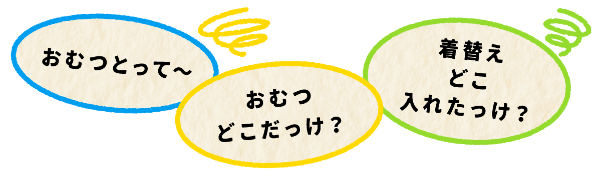 夫婦間で「緑ポケットにあるおむつ取って!」や子どもに「青ポケットにおもちゃしまおっか?」といったコミュニケーションが取れます。