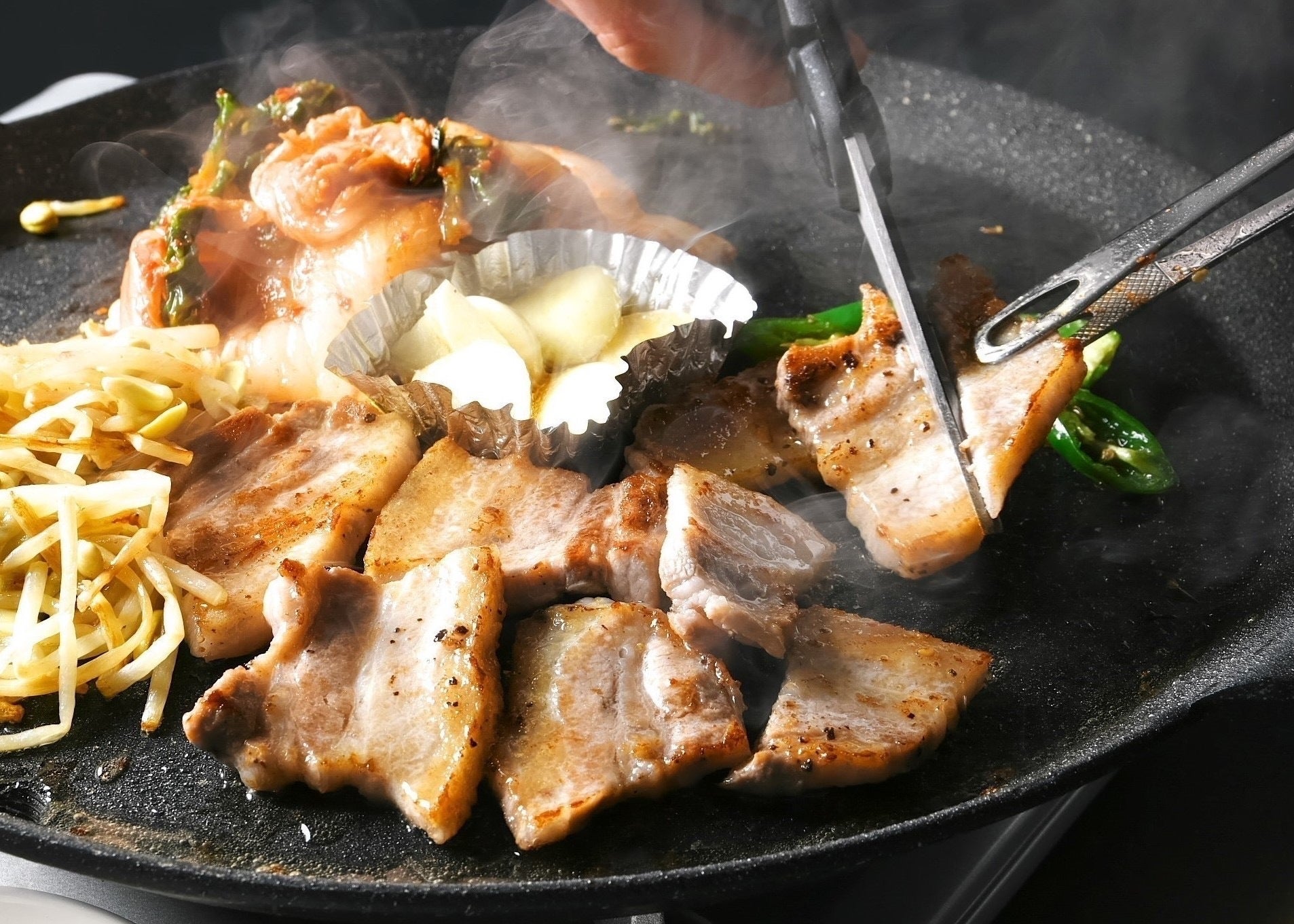 韓国料理人気No.1のサムギョプサルに使用する銘柄豚【岩中三元豚】は脂と赤身のバランスが良くジューシーで旨みもしっかりサンチュに巻いてヘルシーに召し上がっていただけます。ニンニクは青森ニンニクを使用しており栄養価の高い選りすぐりの物を選んでいます。付け合わせの豆もやしは毎朝畑から新鮮なシャッキシャキの極上豆もやしが届きます。沢山の方のお陰様が集結した明心館のサムギョプサルを是非お召し上がりいただきたく思います。