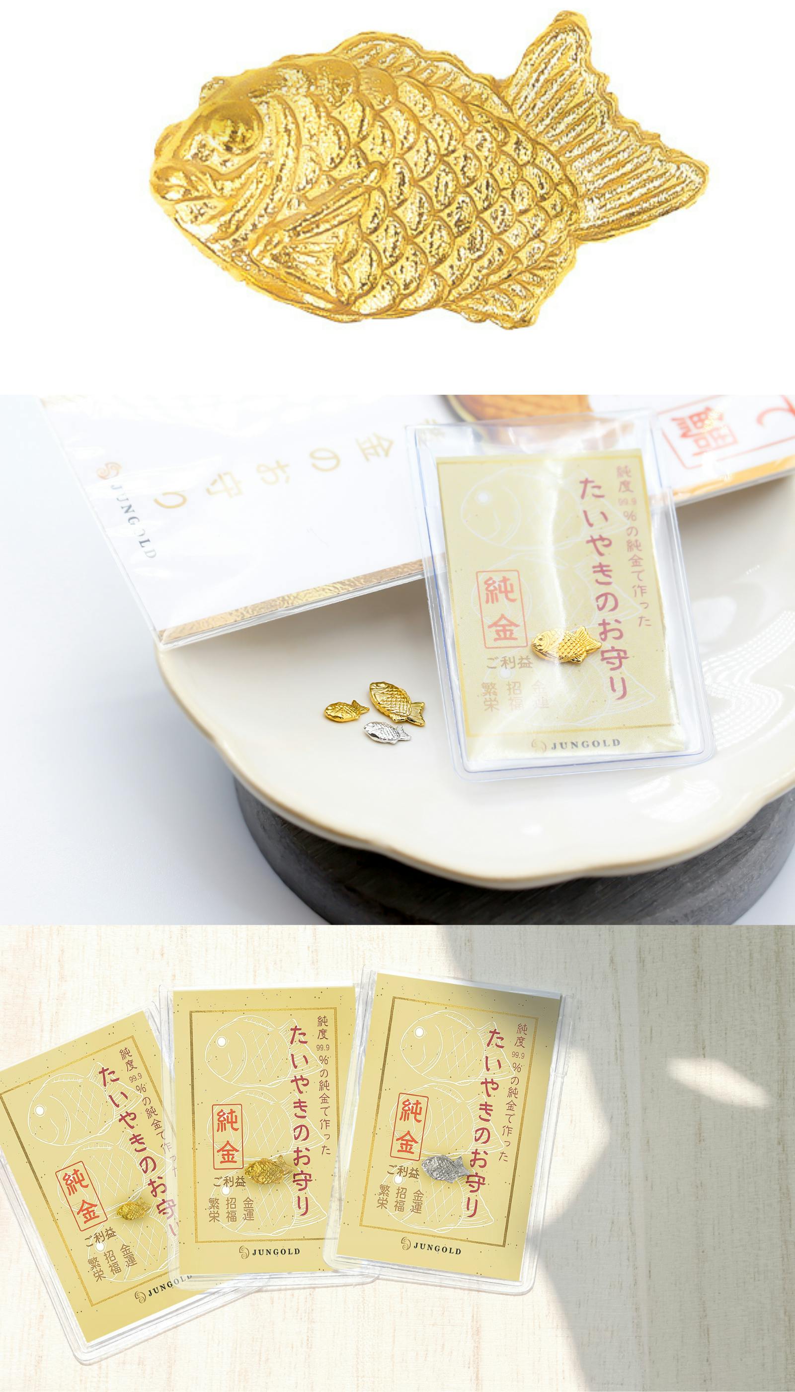 *画像 下:左から たいやきのお守り(小)K24純金 / たい焼きのお守り(大)K24純金 / たいやきのお守り(大)プラチナ1000
