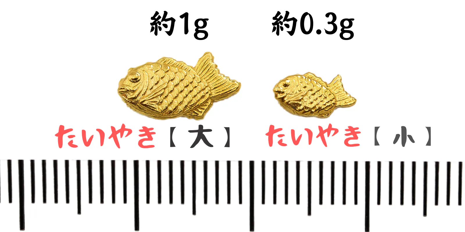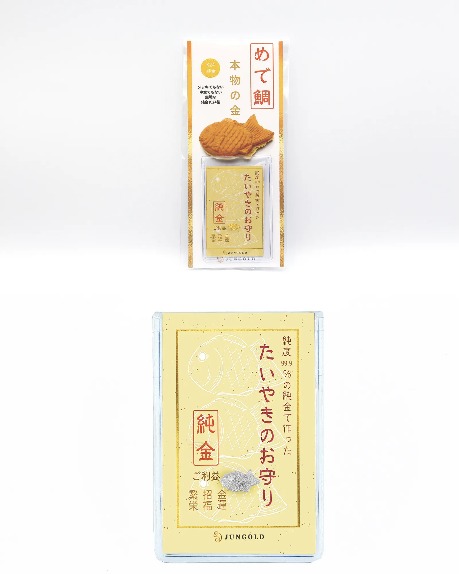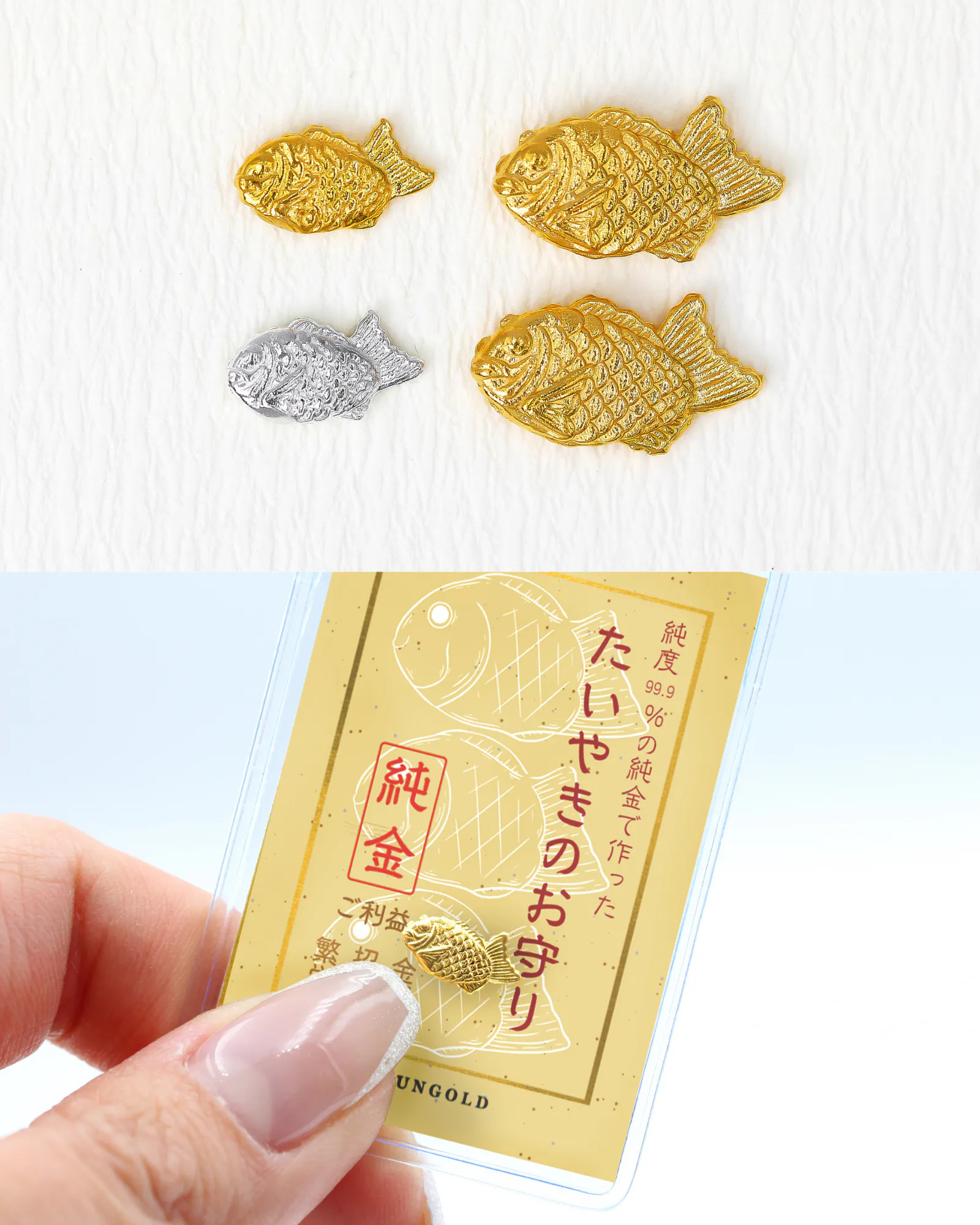 *画像 上:たいやきのお守り(小)K24純金 / 下:たいやきのお守り(大)プラチナ1000