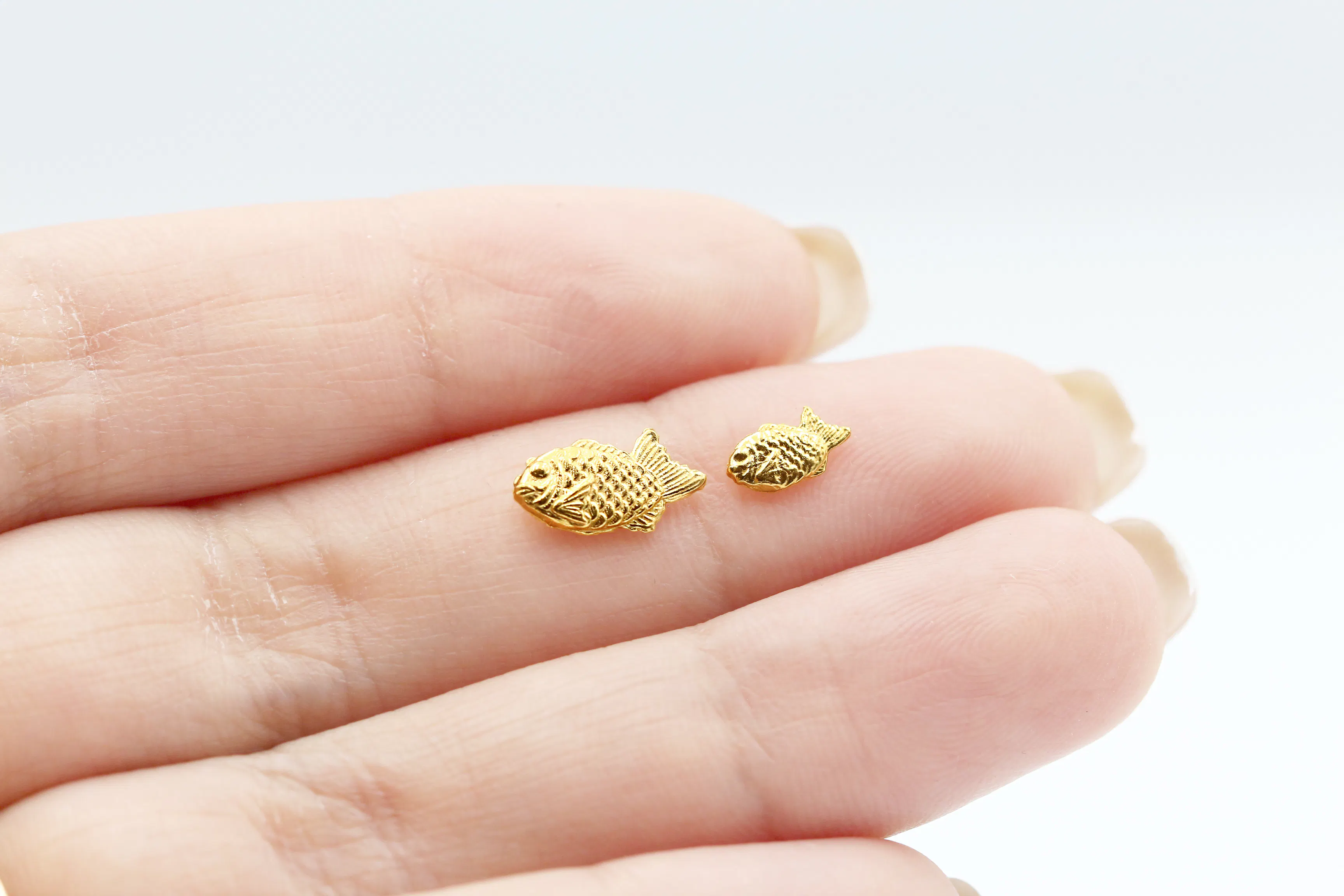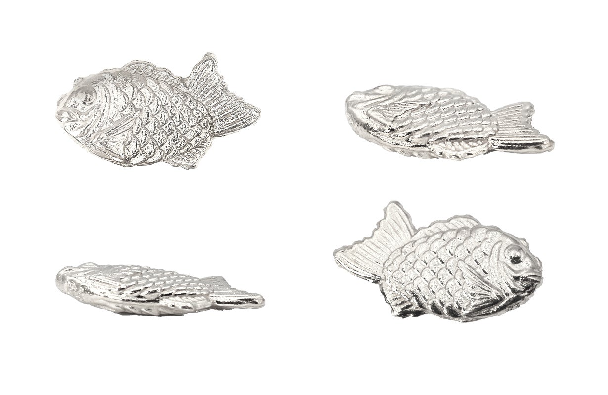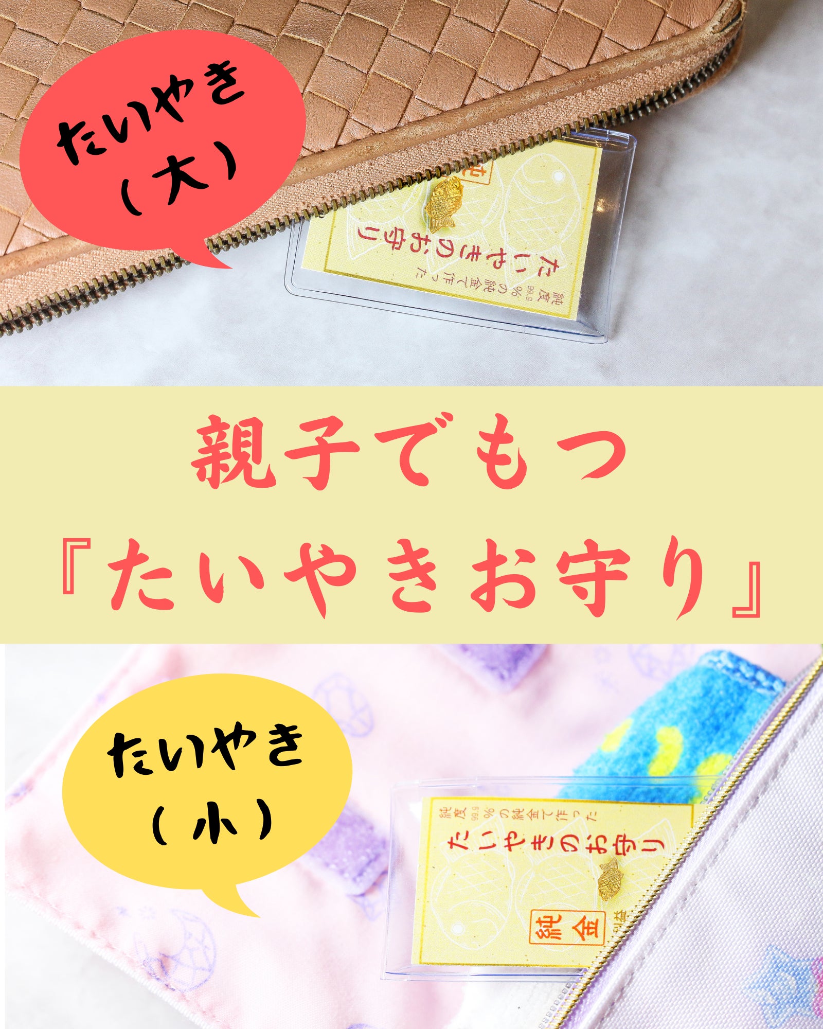 *画像 上:たいやきのお守り(小)K24純金 / 下:たいやきのお守り(大)プラチナ1000