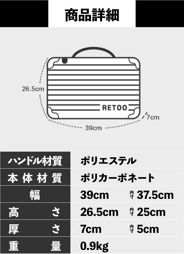 Retooは、スーツケースなどの旅行用品を製造するブランドです。スーツケースづくりのノウハウを活かして、毎日持ち歩くノートパソコン用のケースを作りました。Retooの創業者は、「なぜ、完璧なデザインで、丈夫で、長持ちする、自分好みのキャリーが見つからないのか」といつも考えていました。頻繁に飛行機を利用する彼は、本体が壊れたり、車輪が壊れたりしたキャリアを何度も経験しました。他の多くのキャリアの長所と短所を検討し、キャリアに最適な特性だけを備えたRETOOが生まれました。RETOOと旅を共にする。RETOOは、あなたの快適さと利便性のために作られました 私たちの会社が拡大するにつれて、情熱的な旅行者のための様々な旅行キットやキャリアを提供していきたいと考えています。