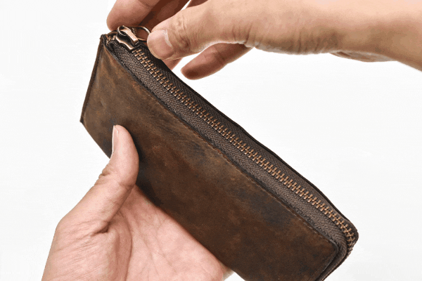 財布を紙幣サイズギリギリに仕上げているため、しっかりと収納しないとファスナーに噛んでしまう場合があります。