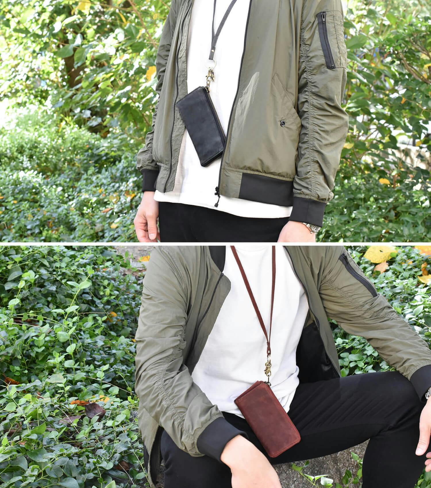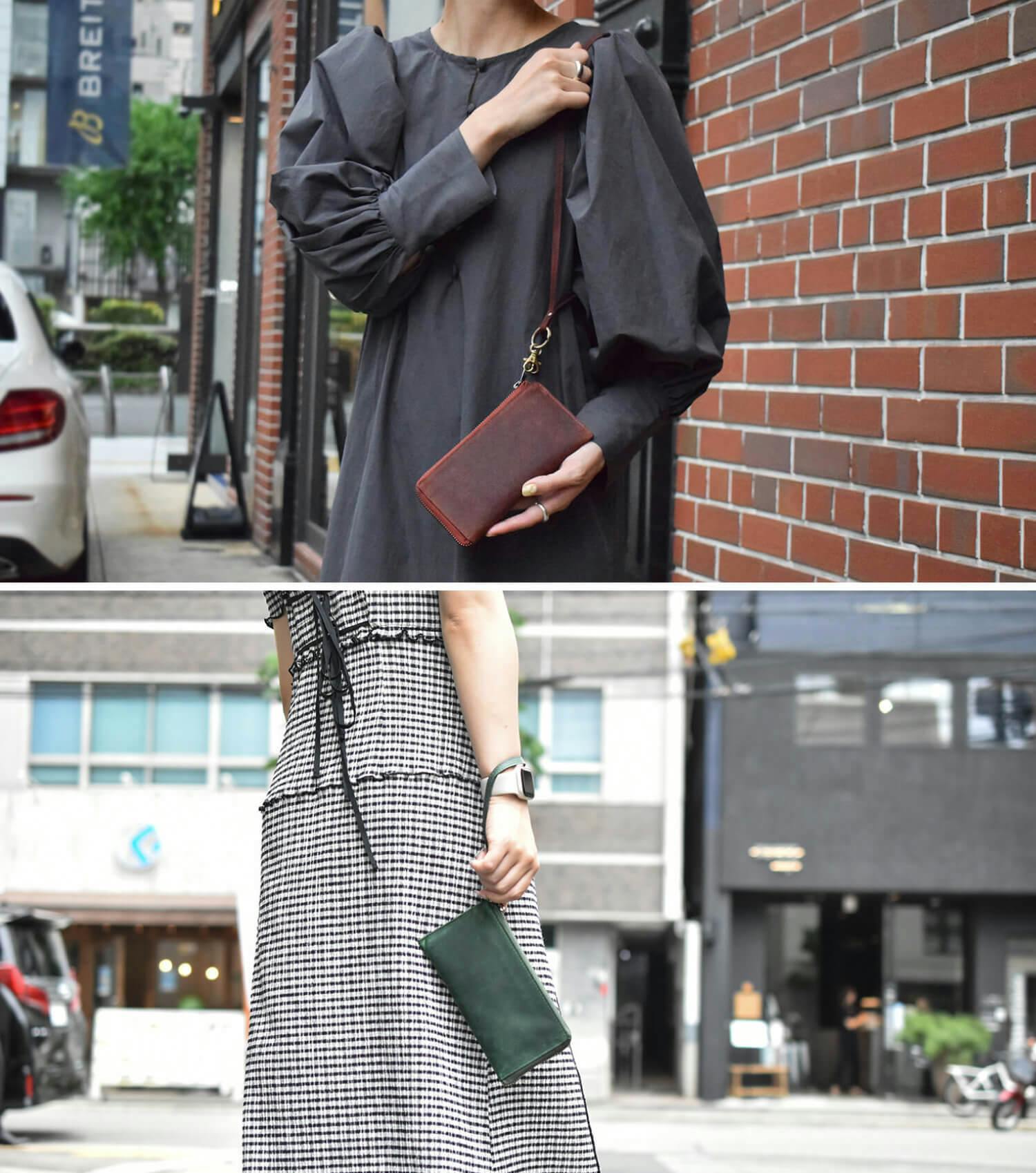 財布にストラップを繋げることで、ショルダーバッグや、首から提げるミニバッグのように使えるので、スマホと財布だけで身軽にお出かけが出来ます。