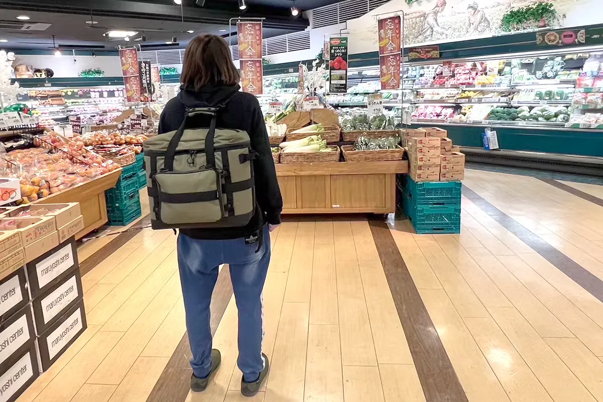 スーパーに背負って持っていけば、キャンプの買い出しをそのまま入れられるので、めちゃくちゃ便利です。