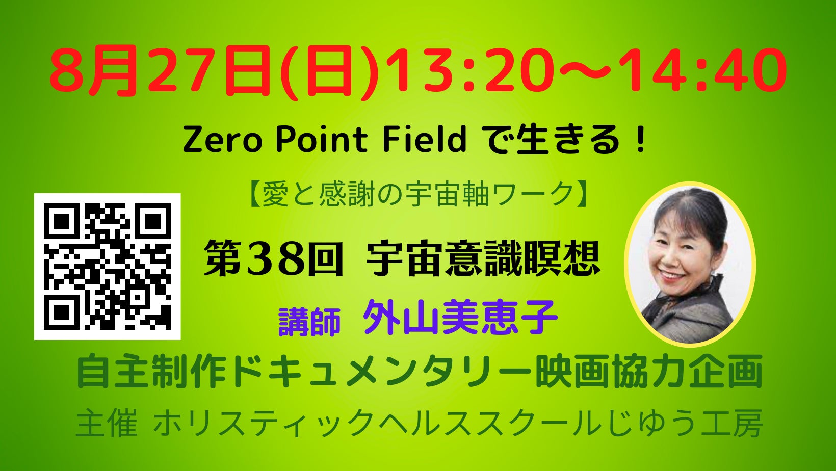 本日もご支援をいただきありがとうございます。映画のタイトルになっている「氣は未来を開く」とは?とよくご質問いただきます。その一端を82歳にしてなお元気はつらつ!の監督外山美恵子の月例特別講座~ゼロポイントフィールドで生きる!【愛と感謝の宇宙軸ワーク】~第38回「宇宙意識瞑想」の中でお話しいただきます。昨日もお知らせしましたが、当プロジェクトファーストゴール100万円初日達成記念として、ご支援くださった方々全員に無料でお届けいたします。リアル&オンラインzoom &録画でご対応致します。この機会に新規ご支援をよろしくお願い致します。特別講座は8月27日(日)13:20〜14:40に開催いたします。下記よりお申し込みください。皆さまのご参加お待ちしてます。https://bit.ly/3DD4QfH