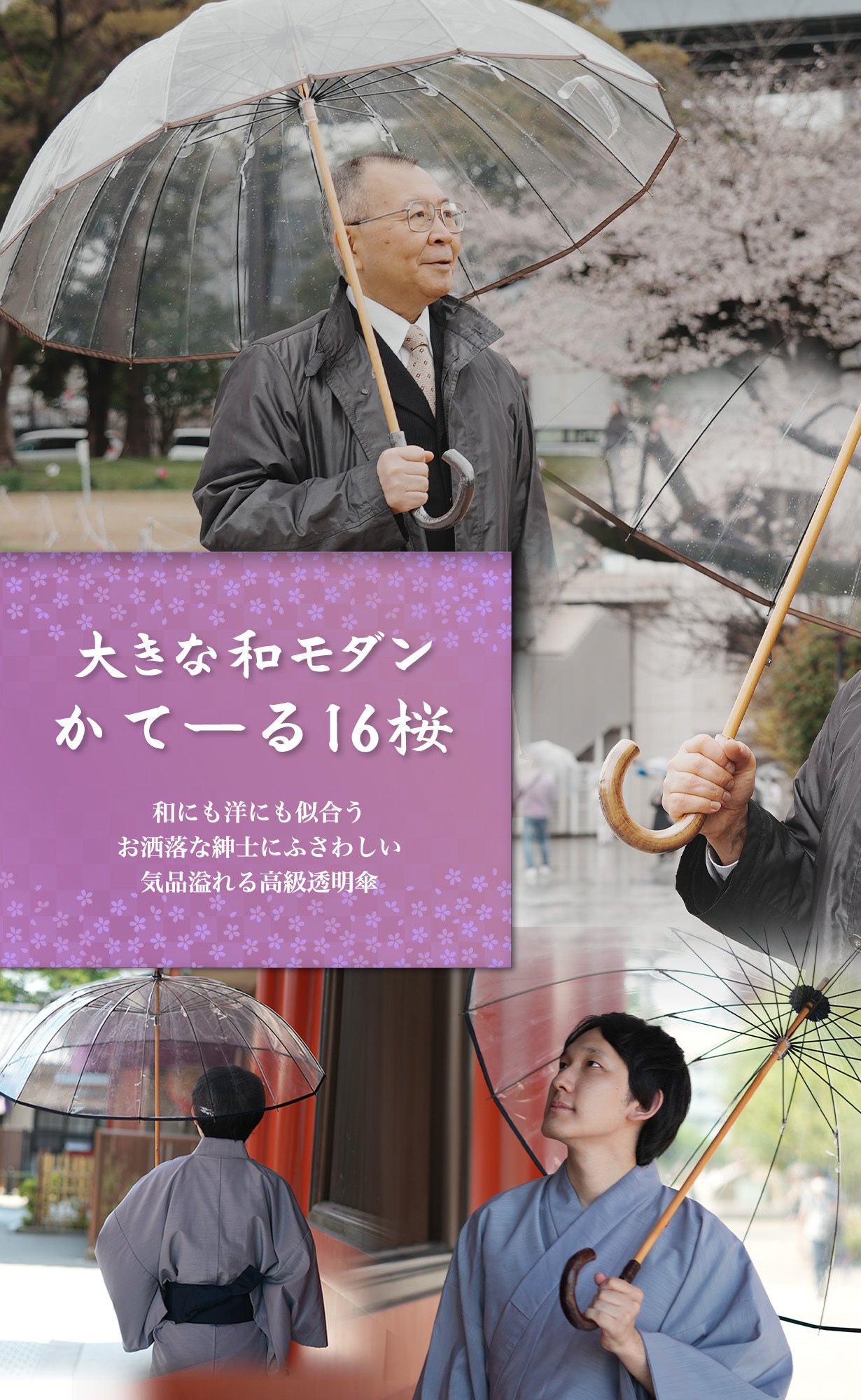 今回は「かてーる16桜」(男性用)と「十六夜桜(いざよいさくら)」(女性用)の2種類の傘ををご用意。今回それぞれ持ち手の素材が天然木「桜」か「椿」をお選びいただけます。