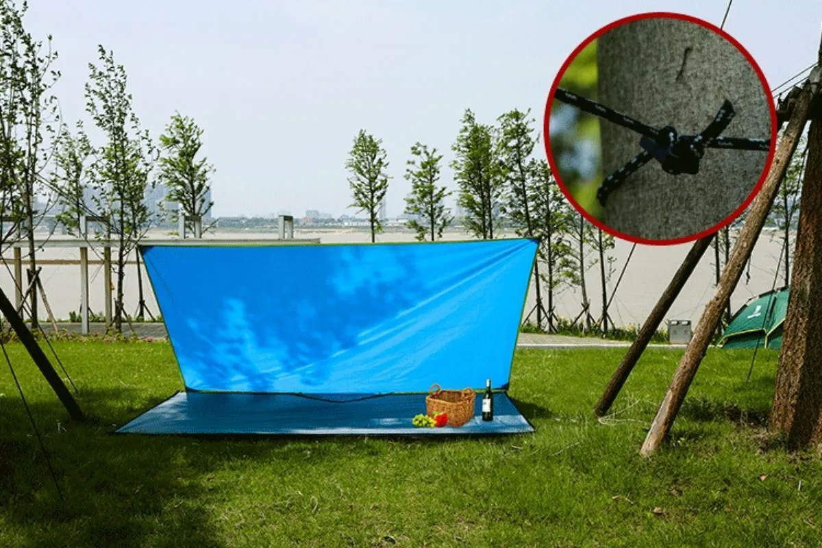 強い日差しが気になるときにペグとロープを使用すれば、ご覧のようにサンシェードに早変わり。