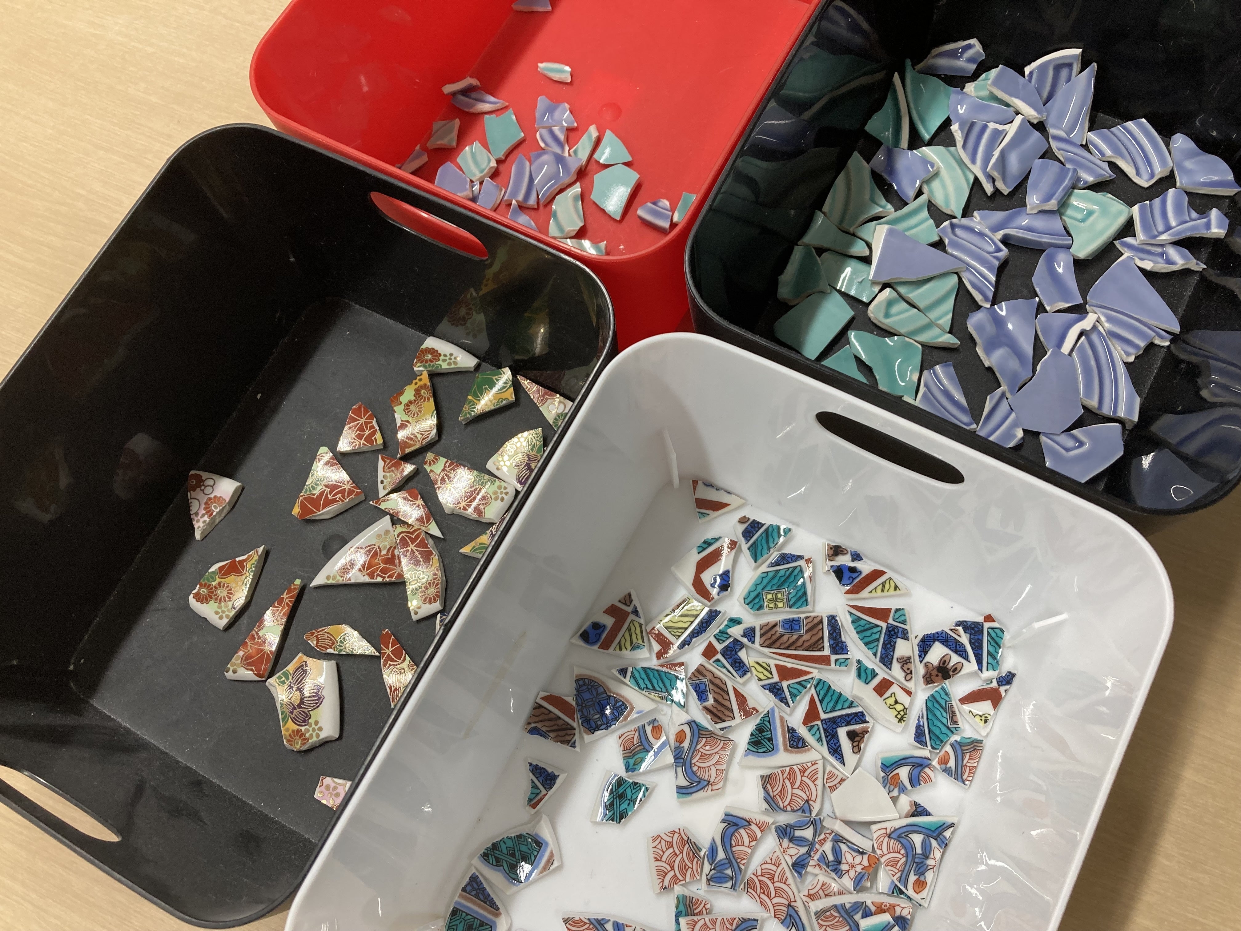 九谷焼アクセサリー作りの体験用の陶片作り。ダメになった九谷焼をアクセサリーに変身!SDGsにも貢献できる体験です。イヤリングにピアス、ヘアゴムやペンダント・・・あなたならどんなアクセサリーを作りますか?