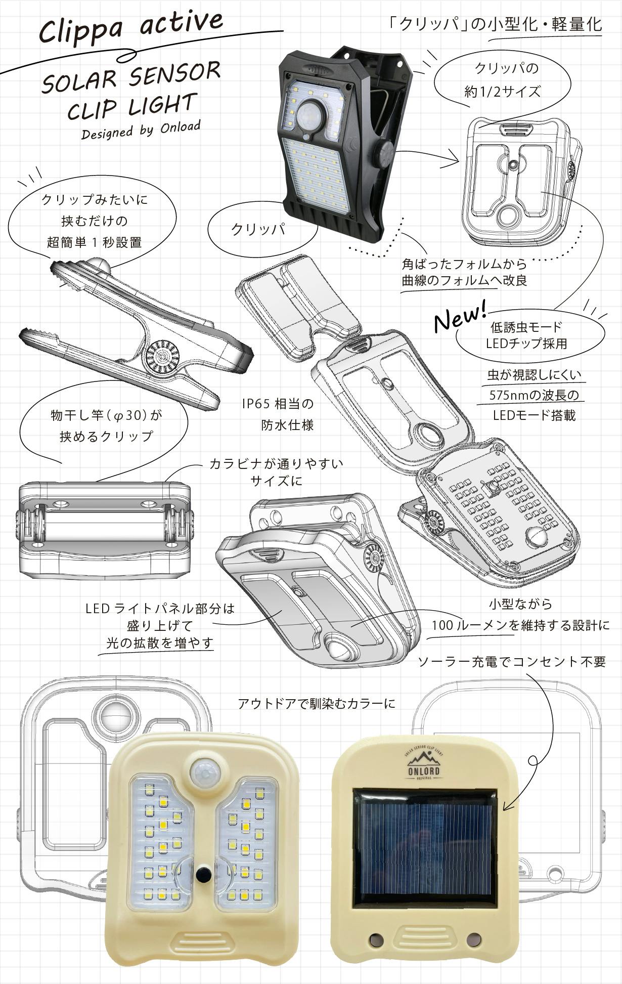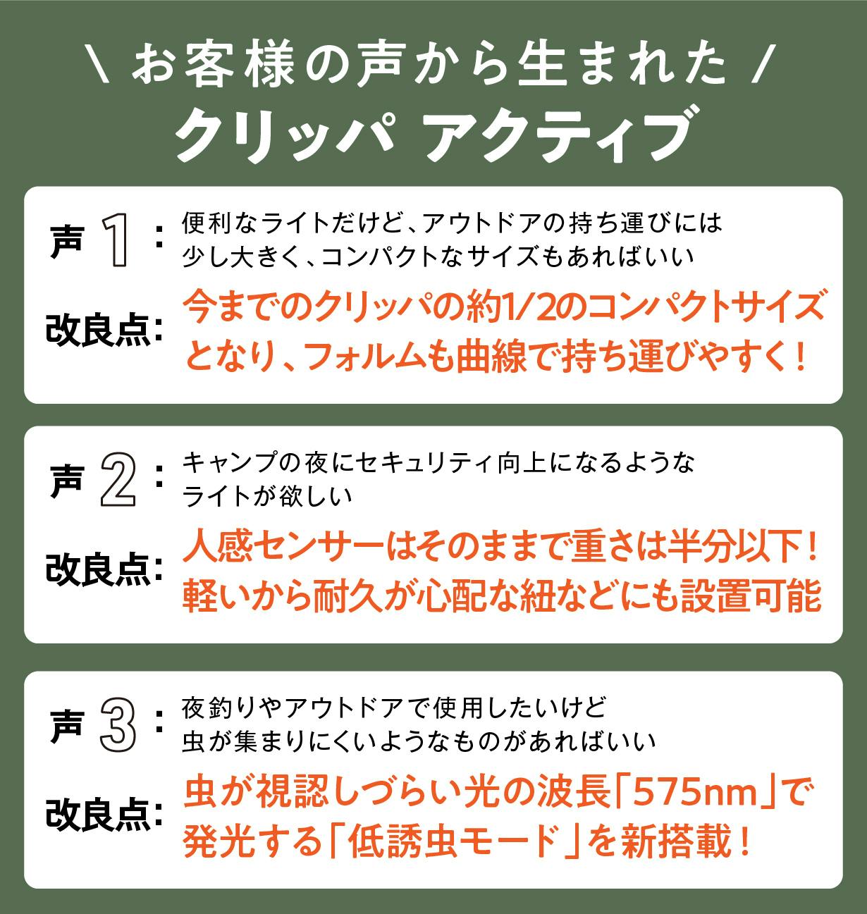 そんな中、アウトドアライフに安心をプラスするために、虫が光と感じにくい波長の光を放つ「低誘虫モード」と、人が近づくと自動発光する「人感センサー」を搭載した、究極のクリップ型ライト『クリッパActive』を新たに開発しました。
