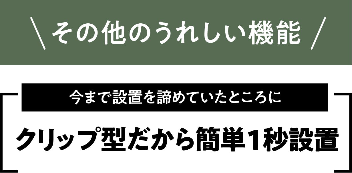 『クリッパActive』の最大の特長は、名前の通りどこにでも挟んで設置できることですが、もちろん、ぶら下げたり置いたりといった設置も可能です。クリップ形状の握り側は、立たせて使用することも考慮したバランスの良いデザインになっています。