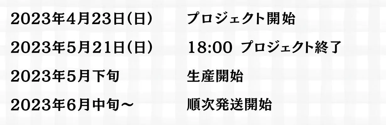 ※本文中に記載させていただいたスケジュールは、あくまでプロジェクト公開時点の予定です。支援購入の性質上、配送遅延のおそれがございます。