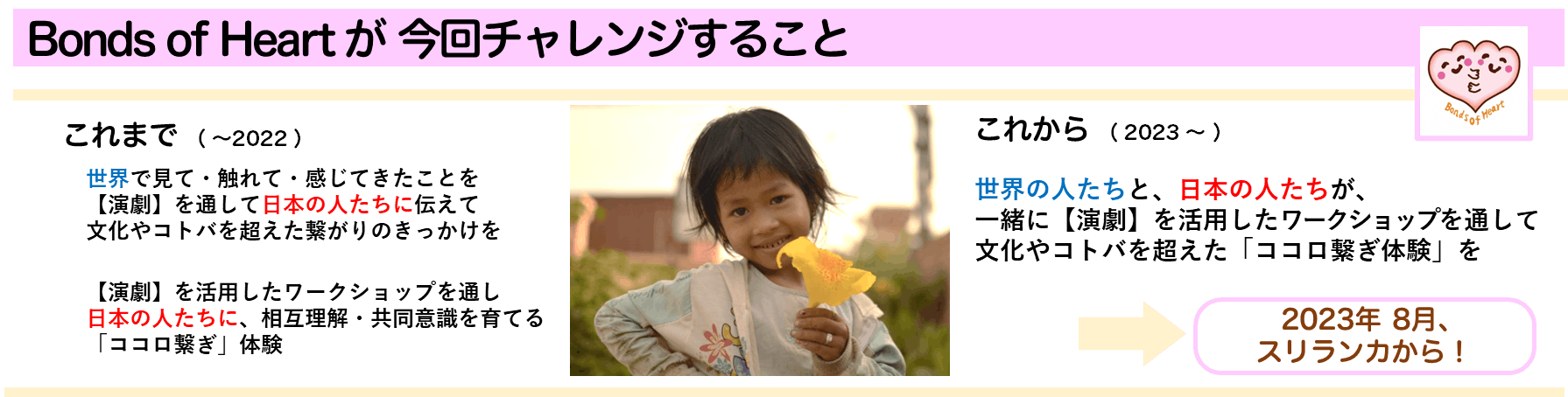 この舞台を、Bonds of Heartの「国境を超えたココロ繋ぎ活動」の最初の舞台としたいのです。