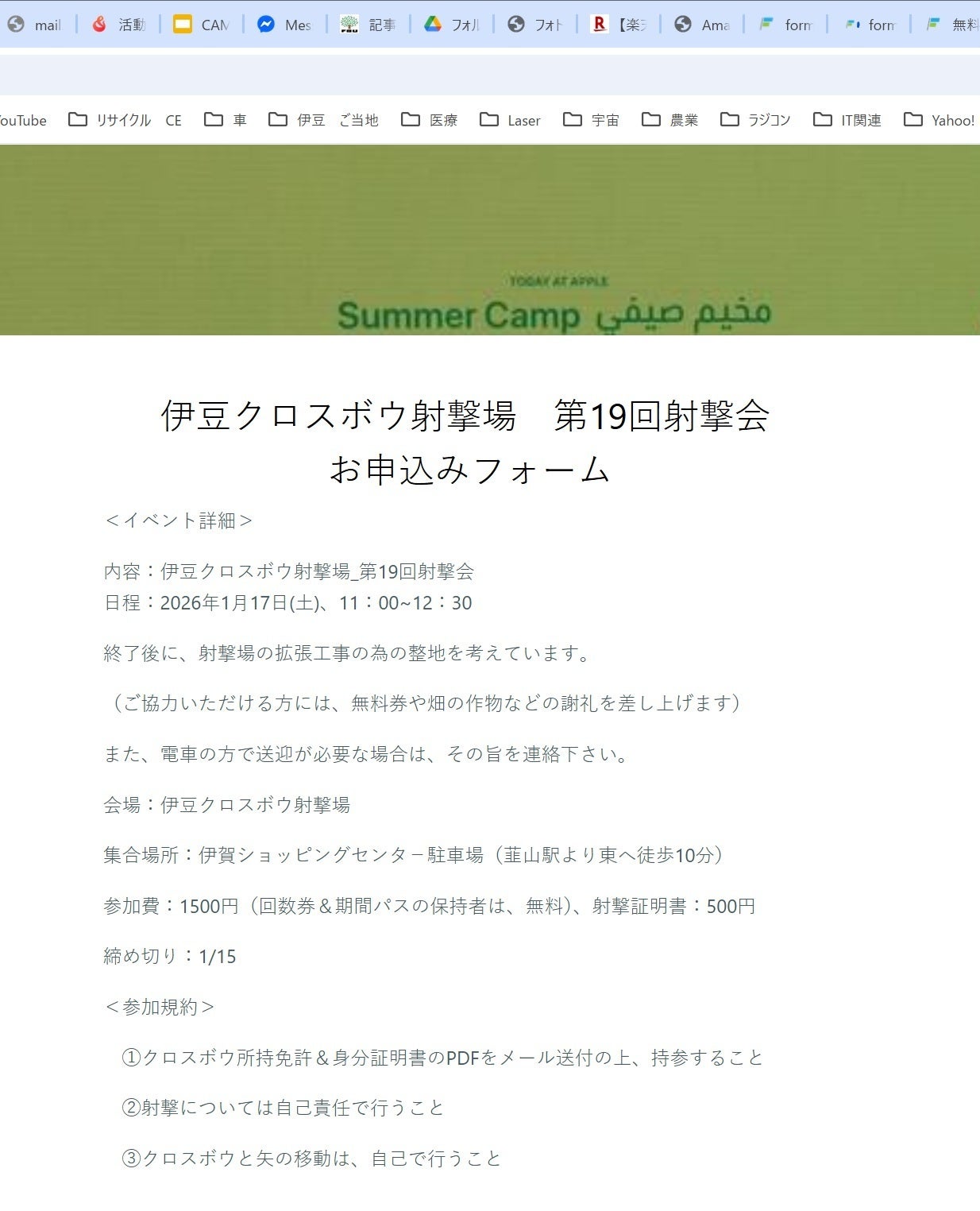 内容:伊豆クロスボウ射撃場_射撃会・日程:2026年4月11日(土)、11:00~12:30 上記日程が、雨の場合は、以下になります。・予備日程:2026年4月18日(土)、11:00~12:30上記のどちらかで開催予定です。参加希望の方は、4/8までに申し込みください。また、電車の方で送迎が必要な場合は、その旨を連絡下さい。会場:伊豆クロスボウ射撃場集合場所:伊賀ショッピングセンタ-駐車場(韮山駅より東へ徒歩10分)参加費:1500円(回数券&期間パスの保持者は、無料)、射撃証明書:500円締め切り:4/8<参加規約> ①クロスボウ所持免許&身分証明書のPDFをメール送付の上、持参すること ②射撃については自己責任で行うこと ③クロスボウと矢の移動は、自己で行うこと