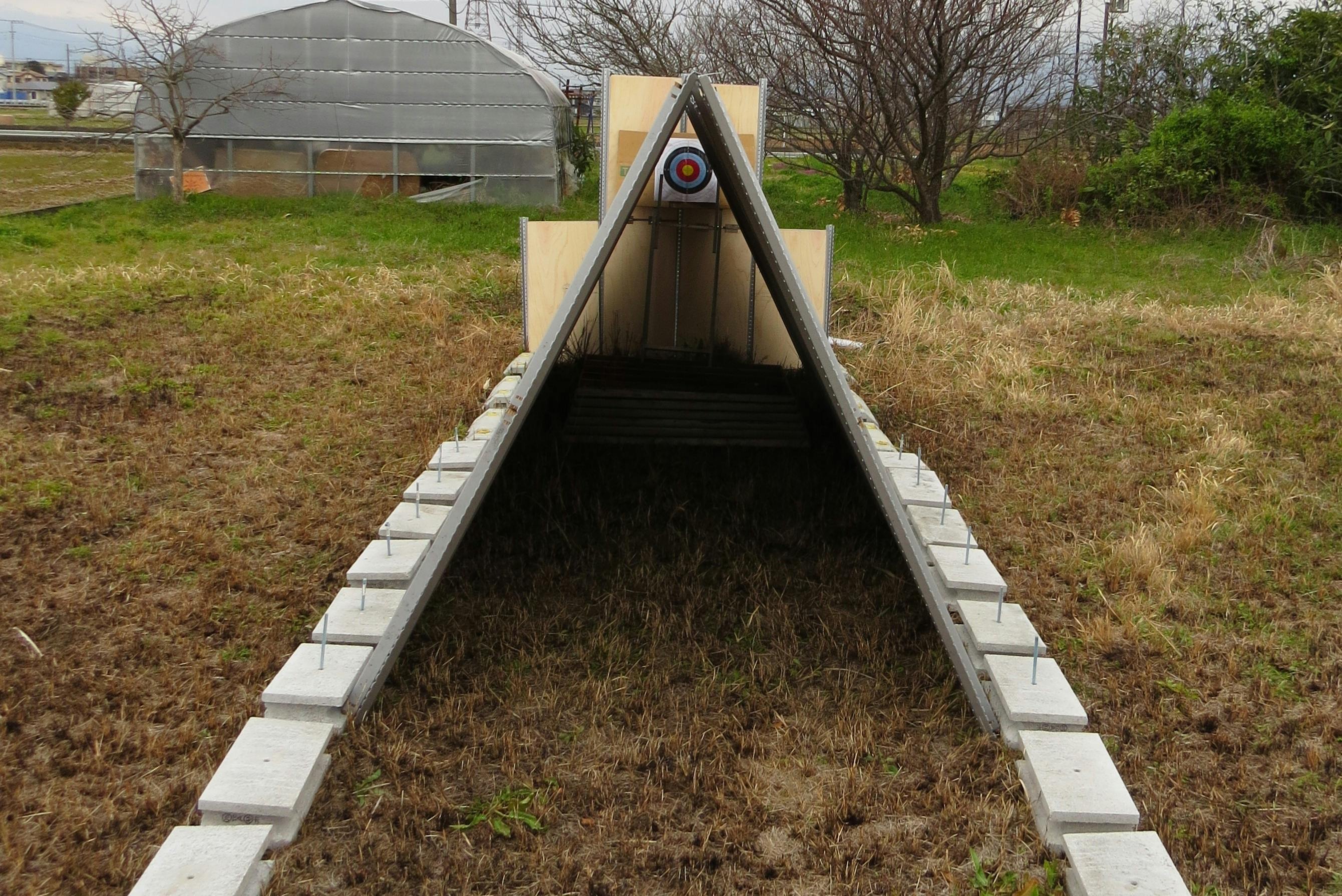 今後は、上部と的付近の隙間の埋め方の検討と、山地の斜面への設置における補強や地ならし方法を検討したいと思っています。