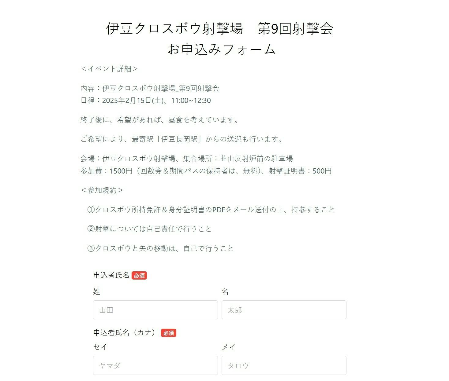 ★皆様、新年あけましておめでとうございます!!☆本年も、よろしくお願いいたします!第八回射撃会の開催日時を決定しました。開催日時:2025年1月18日(土)、11:00~12:30集合場所:史跡_韮山反射炉_ガイダンスセンター前の駐車場ご希望の方は、webページからの予約、もしくは、メールで連絡ください!web→https://izu-crossbow-shooting-web.jimdosite.com/メ-ル→halhalhal3193@gmail.comよろしくお願いします