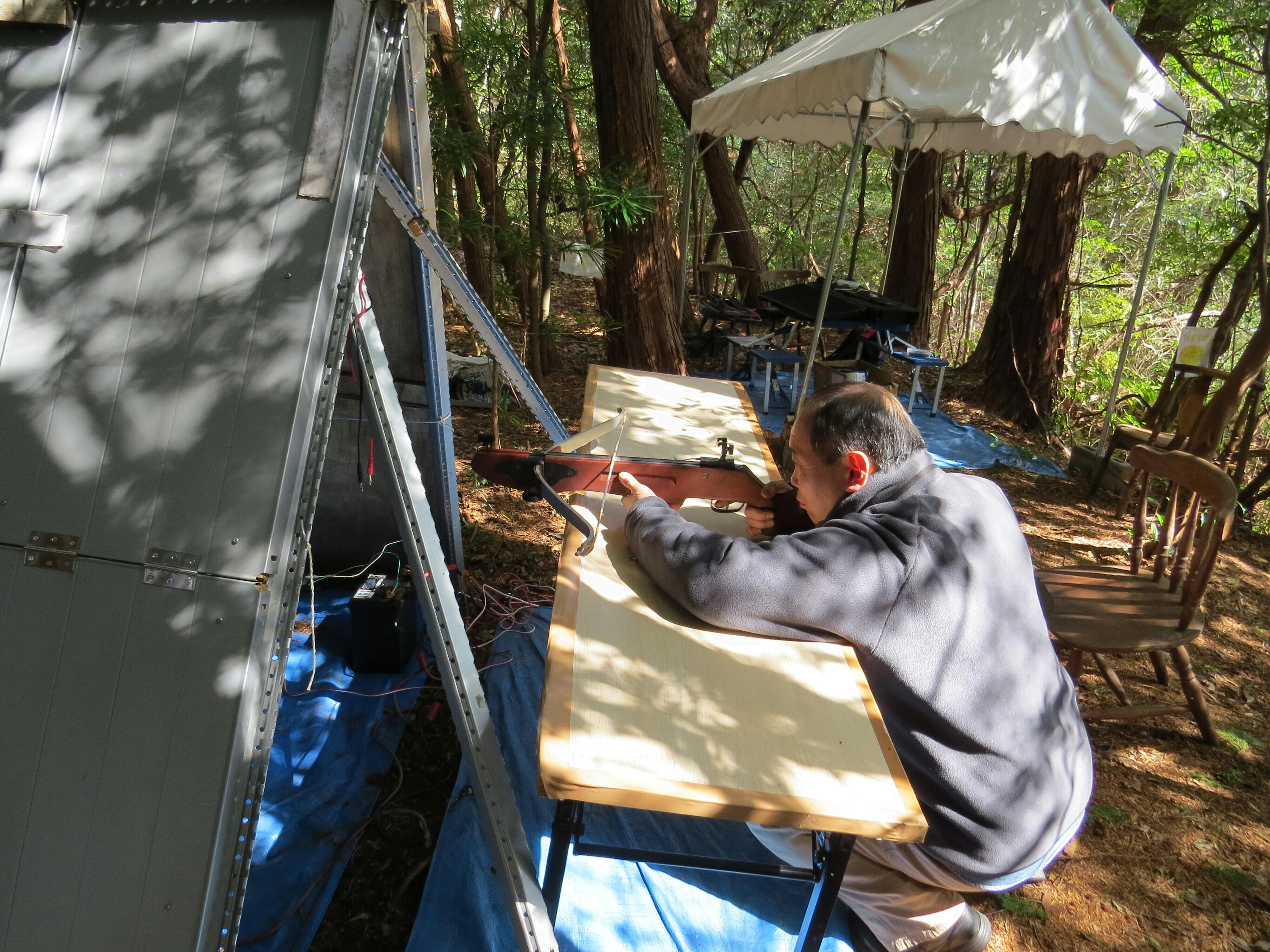 第9回射撃会を開催しました。今回の参加者は、一人で、真下康弘氏でした。当日は、風もなく晴れていて、2月中旬にしては、暖かい天気でした。(前日の夜には、雨が降っていましたが・・・)今回の真下氏の弓部分は、金属製のもので、日本には、2台しかない貴重な物のようです。私も、初めて見ました。(ボウガン協会製とのことですが、ボウガン協会では射撃できなくなったとのこと。ひどい話ですね・・・)