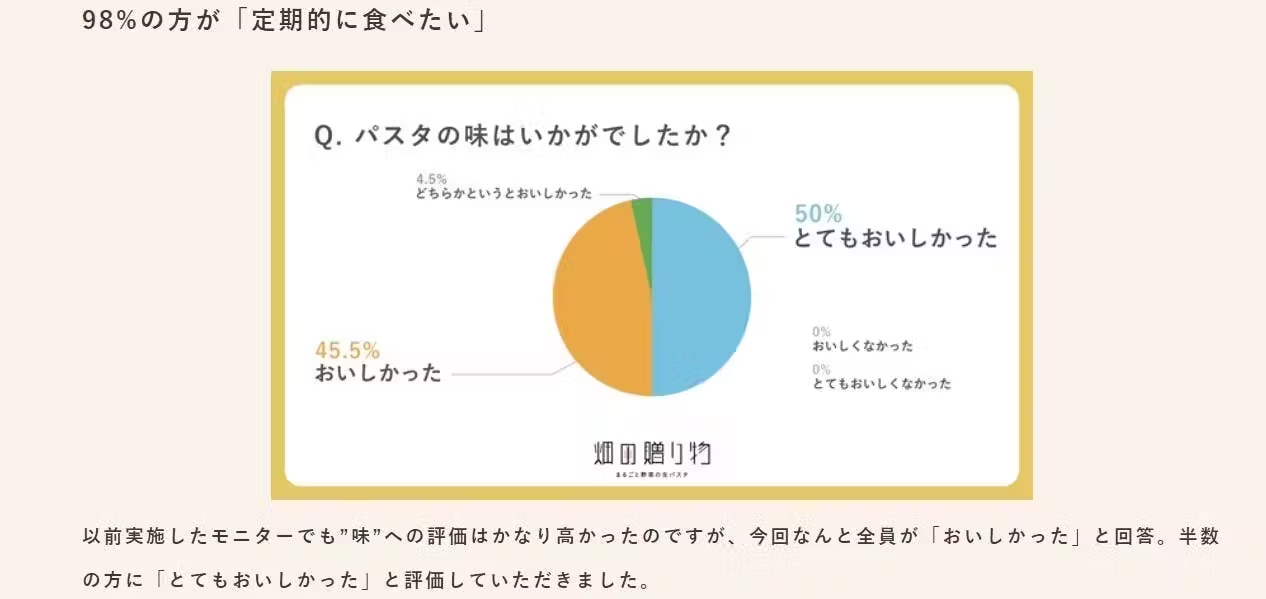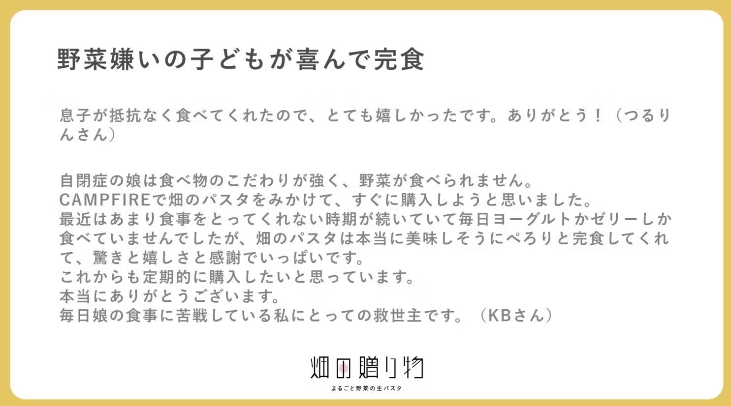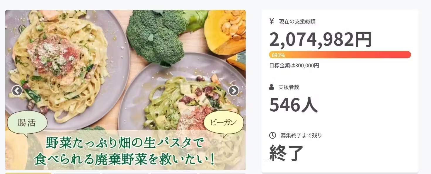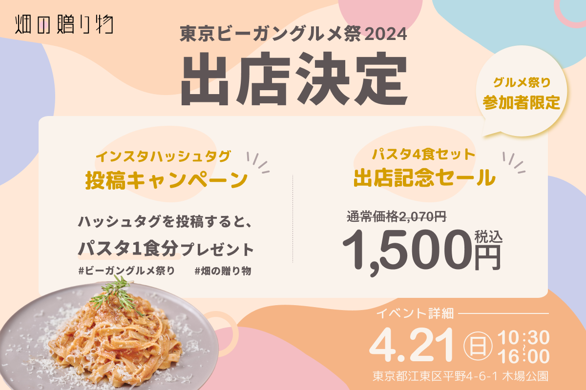 2024/04/13 13:00この度は、ご支援いただき誠にありがとうございました!生パスタ・ソースのお味はいかがでしたでしょうか?是非、ご感想もシェアしていただけるとすごくうれしいです♪そして、この度”畑の贈り物”が4月21日(日)木場公園にて開催される”東京ビーガングルメ祭 2024”に出店することが決定しました!美味しさと健康を追求するビーガングルメ祭りならではのお楽しみが盛りだくさんです!当日は2つのキャンペーンをご用意いたします!【東京ビーガングルメ祭 2024 出店記念セール】畑の生パスタ4食セット通常販売価格2,070円→1,500円にて販売!お得なこの機会をお見逃しなく!【インスタハッシュタグ投稿キャンペーン】#ビーガングルメ祭り #畑の贈り物をつけて当日会場でInstagramに投稿すると、先着100名様限定で、パスタ1食分をプレゼント♪ビーガングルメ祭りをシェアして、特別なご褒美をゲットしましょう!野菜をたっぷり練り込んだプラントベース生パスタでおいしく健康な食生活をお楽しみください♪2024年4月21日(日)木場公園にてお待ちしております!お友達やご家族と一緒に、美味しいビーガングルメを楽しんでいただけることを心よりお待ちしております。 もっと見る