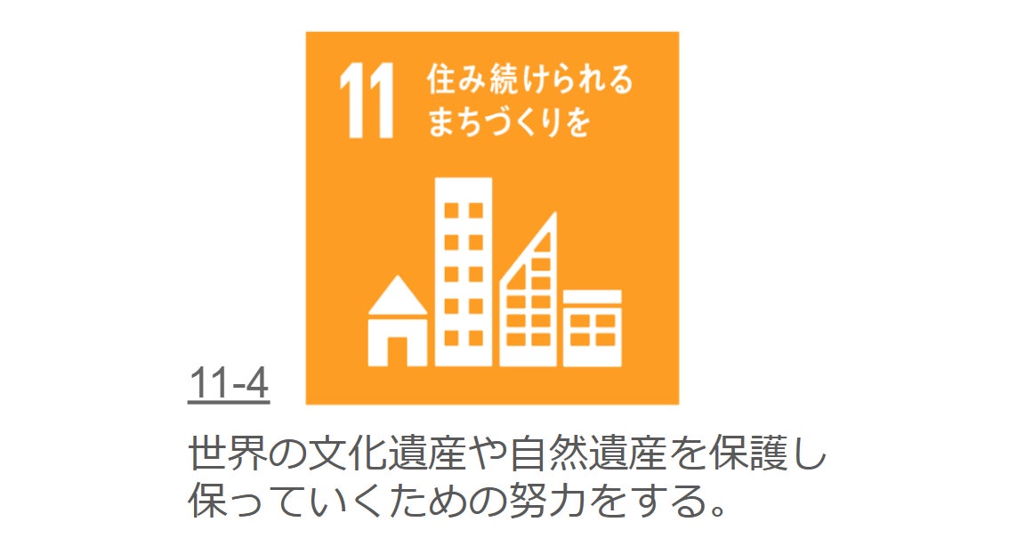 その中でも、私はSDGsNo.11の「住み続けられるまちづくりを」という目標に目が止まりました。その目標の中のターゲットの一つに「世界の文化遺産や自然遺産を保護し、保っていくための努力を強化する」というものがありました。