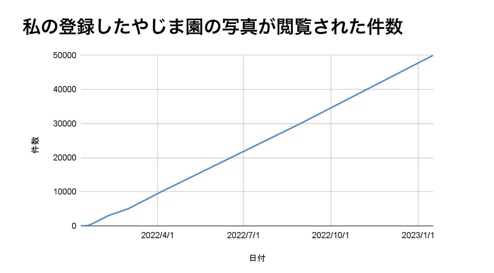 2022年1月10日から2023年1月17日までの記録なのですが、先程も述べたように日付と閲覧件数が比例的に上がっていることがわかります。