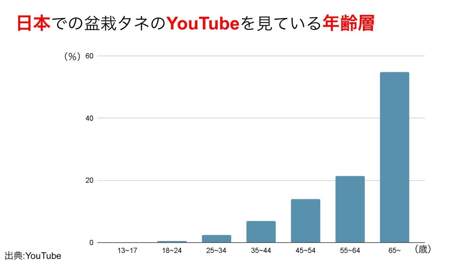 こちらの棒グラフを見てください。これは日本での盆栽タネのYouTubeを見ている人の年齢層についてです。