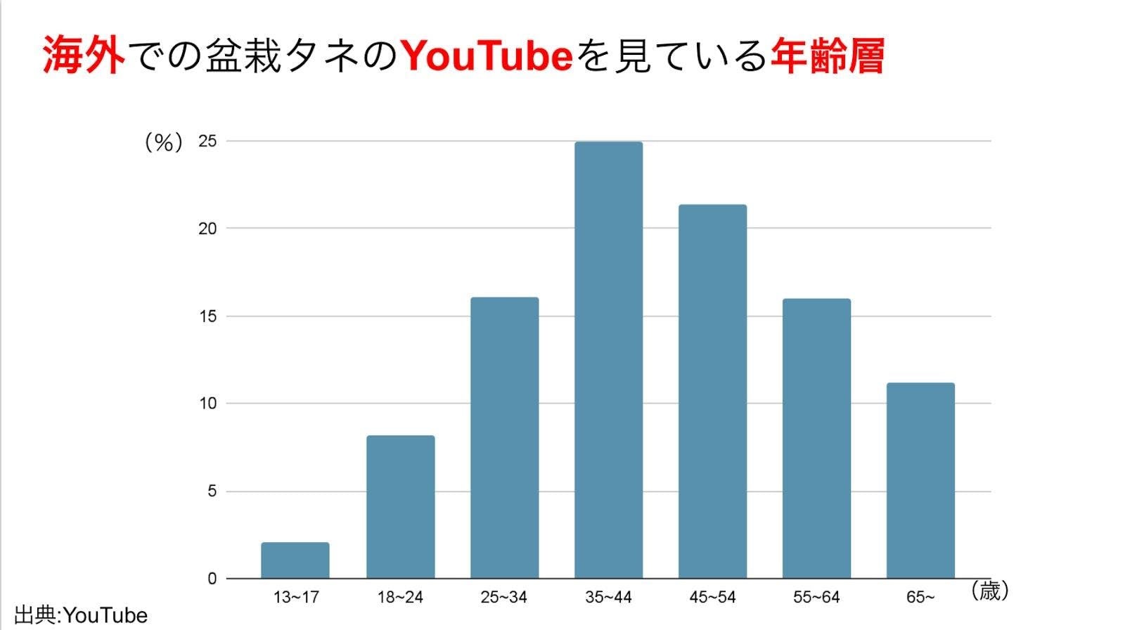 ではこちらの棒グラフをご覧ください。これは海外で盆栽タネのYouTubeを見ている年齢層についてです。