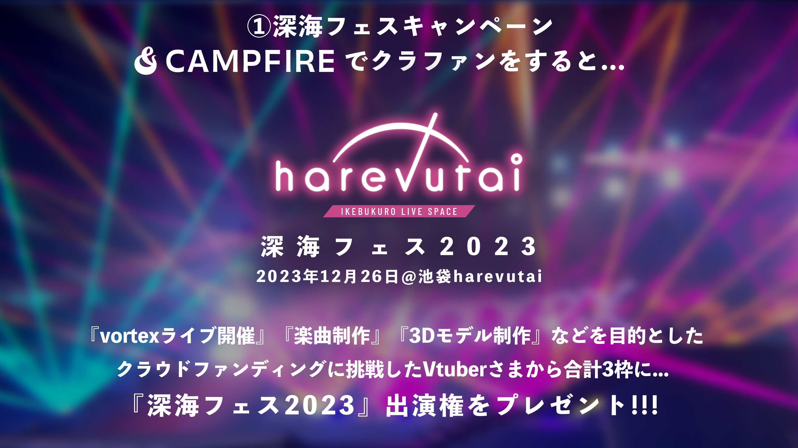 CAMPFIREを使用してクラウドファンディングに挑戦したVtuberから合計3枠に「深海フェス2023」オープニングアクトとして出演権をプレゼントという企画です。
