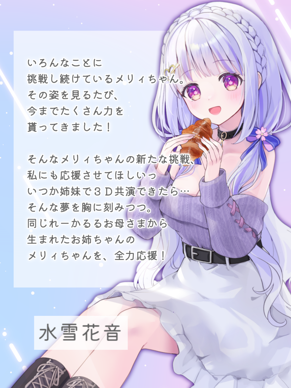 今回3Dモデルになる、現在活動に使用しているLive2Dモデルのキャラクターデザインとイラストを担当頂いています。また、3Dモデルの一部テクスチャも担当して頂く予定です。