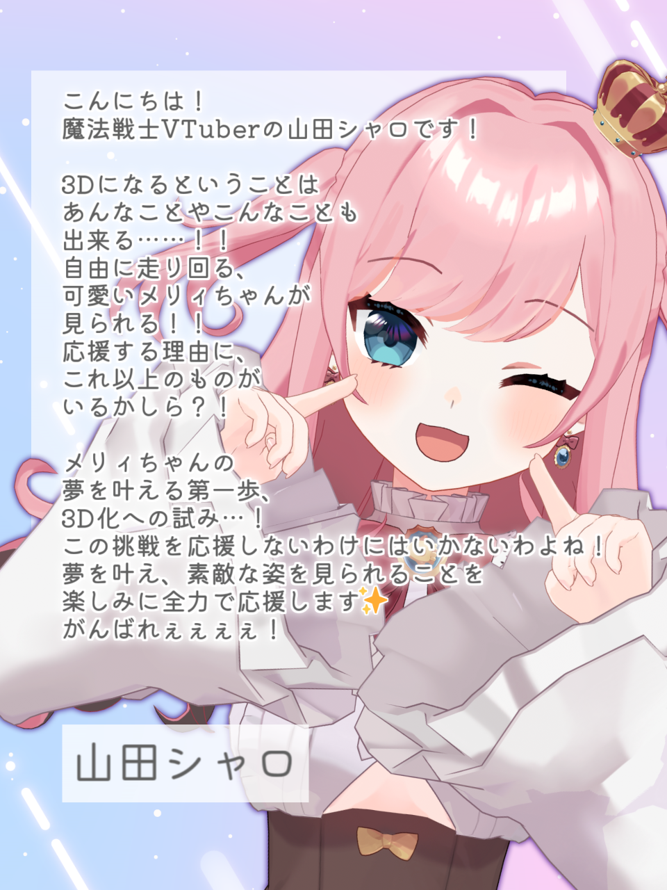 現在使用しているLive2Dモデルでも叶えられるものもあるかもしれませんが、3Dモデルがあれば全身での表現が可能になり、「テレビでレギュラー番組を持ちたい」などより大きな目標にも近づくんじゃないかと思っております。