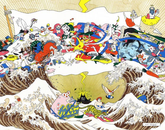 様々なキャラクターがひしめき合うTHE WORLDシリーズは、僕の身近に見た物や人を漫画調に線画化させた、イラストとデザインが融合した絵画作品です。繋がって、絡み会う様子は一つ一つが個性的で愉快。生き物の形や表情を新しい言語を読み取るように解読し探求してみてください。