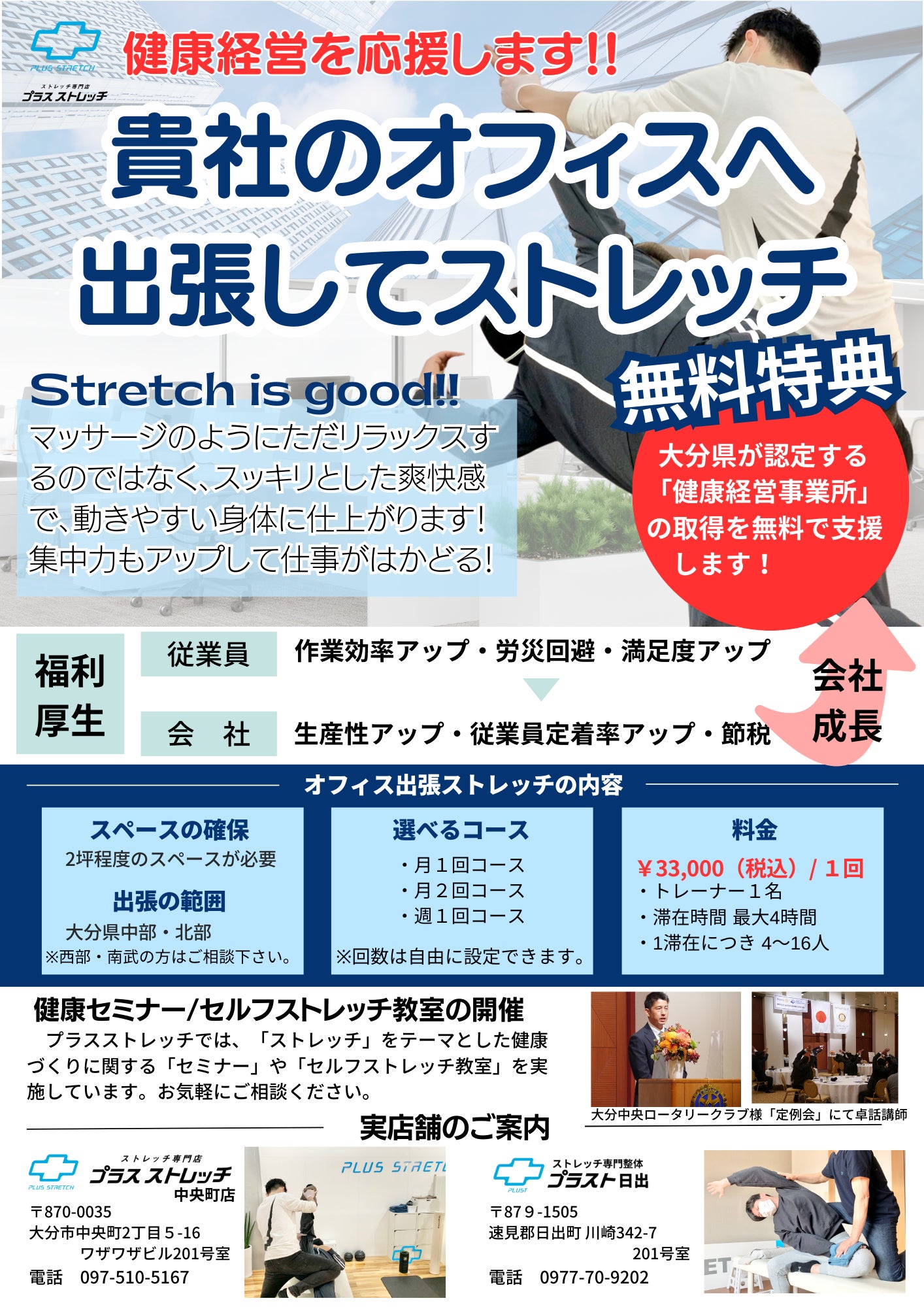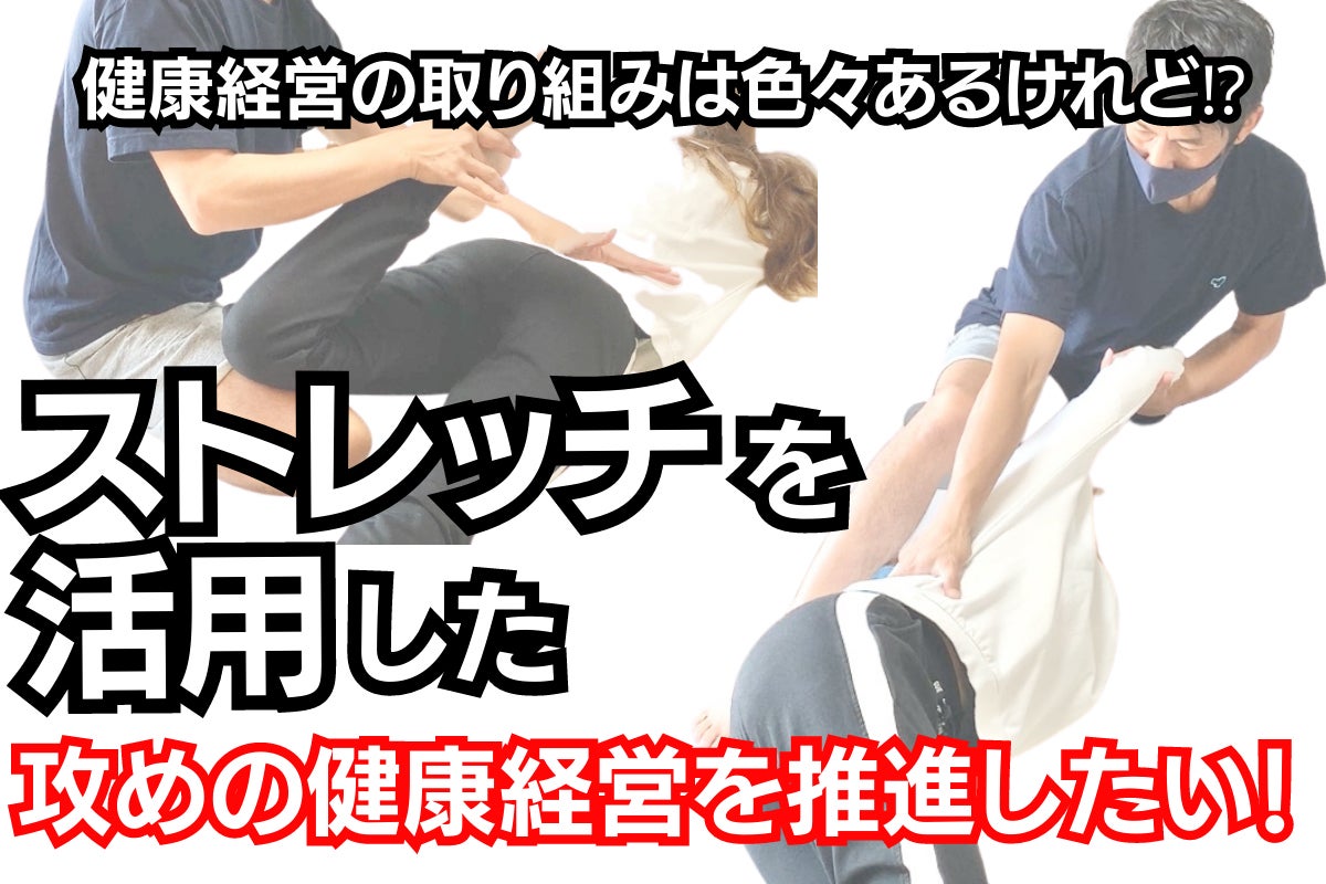 企業の事務所や店舗に出張して、従業員の皆さんにパーソナルストレッチを提供する健康経営サポート事業です。ストレッチの提供に加え、セルフケアのアドバイスやニュースレターの発行により個人個人が健康について考え積極的に意識するよう健康リテラシーの向上についてもサポートします。
