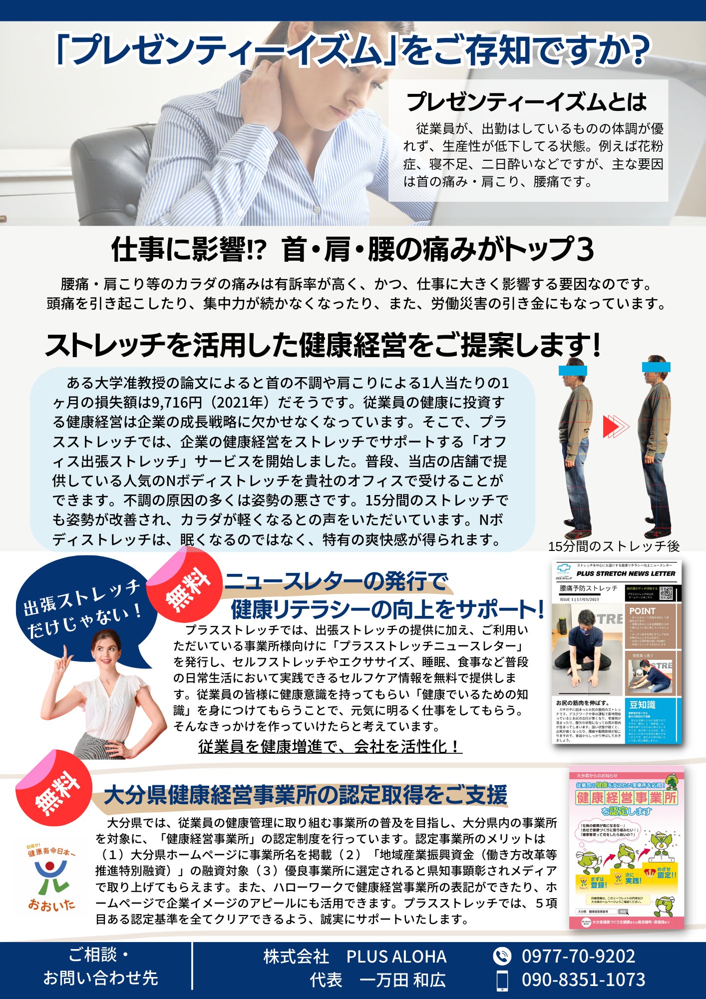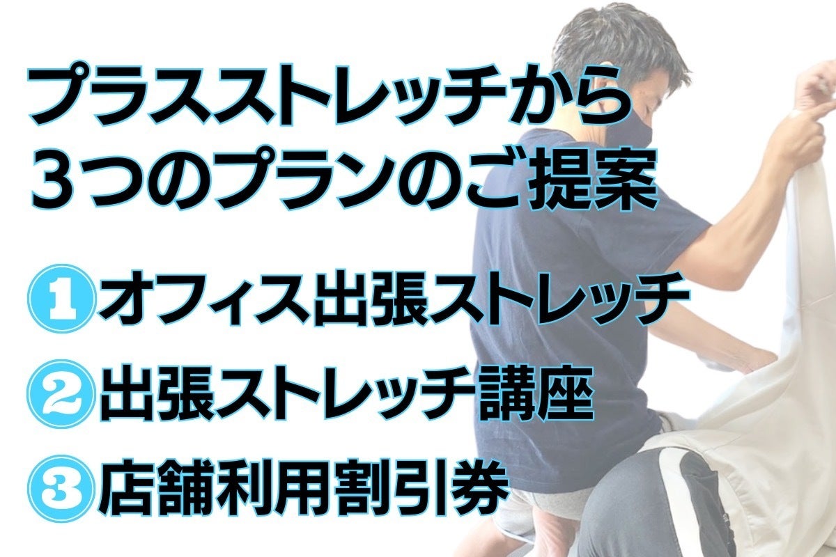・「オフィス出張ストレッチ」をご利用いただいている事業所様向けに「プラスストレッチニュースレター」を発行し、セルフストレッチやエクササイズ、睡眠、食事など普段の日常生活において実践できるセルフケア情報を無料で提供します。従業員の皆様に健康意識を持ってもらい「健康でいるための知識」を身につけてもらうことで、元気に明るく仕事をしてもらう。そんなきっかけを作っていけたらと考えています。
