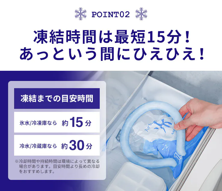 たったの15分、冷凍庫で冷やすだけで約3時間使用できます。