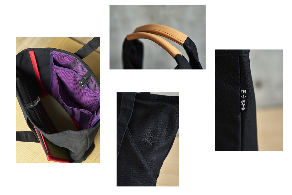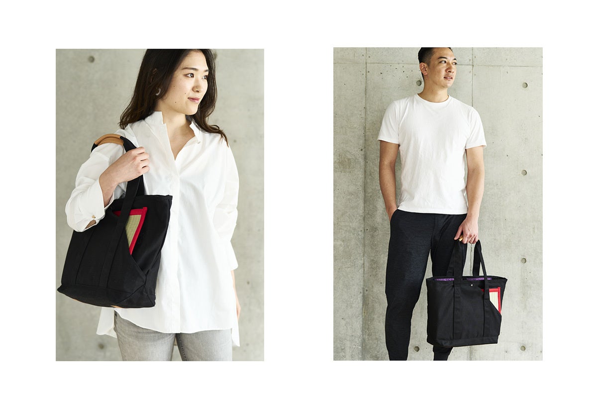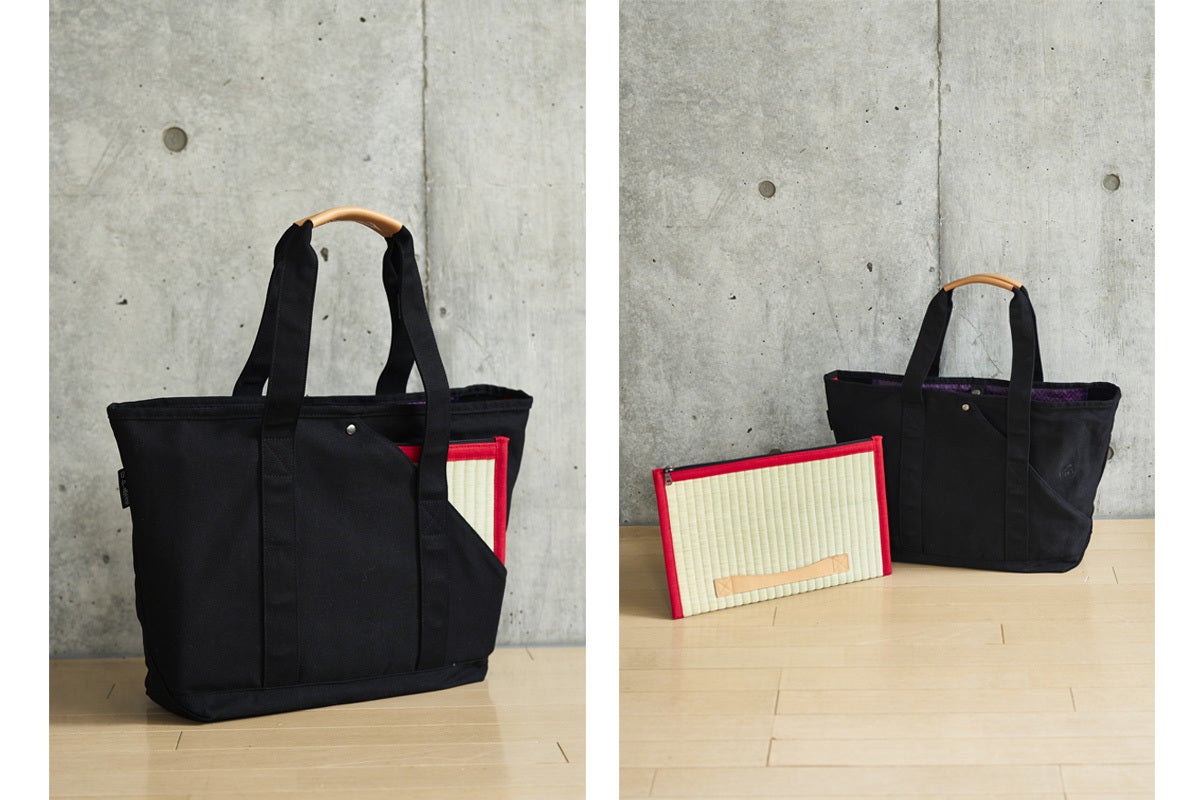 サイズはH34cm×W(T58cm/B36cm)×D13cmです。黒の帆布地にヌメ革を使用しています。畳バッグがトートバッグに収納され、畳をアクセントとして見せます。トートバッグの持ち手、畳バッグにはヌメ革を使用しており、使えば使うほど味が出ます。トートバッグ内にはPCケースがあり機能的な作りとなっています。またトートバッグ内底にも畳を使用しています。デザイン的にトートバッグ自体がインテリアのアクセントとしても使えます。