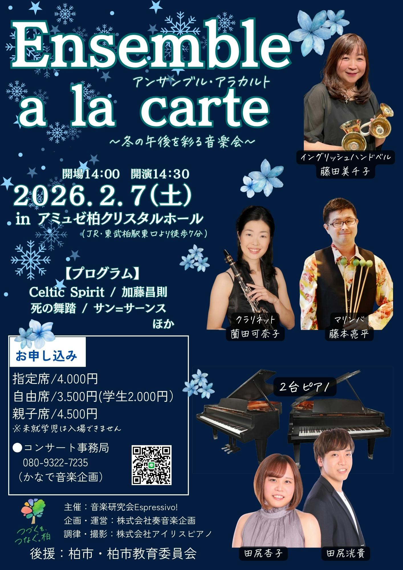 2025/12/29 09:122026年2月7日アミュゼ柏クリスタルホールにてコンサート【Ensemble a la carte】冬の午後を彩る音楽会、が開催されます!今年2月に浦安音楽ホール・ハーモニーホールで開催された「プロローグ完成披露コンサート」そこで祝賀演奏を行い、大好評をいただいたメンバーが、「また聴きたい!」という声にお応えして再び集まります.今回は、クラリネット・マリンバ・ピアノ・2台ピアノ・イングリッシュハンドベルが奏でる豪華で、色彩ゆたかなアンサンブル!内容もさらにパワーアップして、冬の午後を彩る音楽会をお届けします.こんな豪華な編成でありながら、驚くべきリーズナブルな価格でお楽しみいただけます。音楽通の皆さまはもちろん、2台ピアノ初体験の皆さまも!!ぜひご来場をお待ちしております.そして!なんと!!開演前には…柏市のふるさと納税の返礼品にもなっているハンドベル《プロローグ》でのチーム演奏も披露。メンバーはこのコンサートのために、現在6名で練習を重ねております(#^^#) こちらもどうぞお楽しみに。あなたの心にそっと寄り添うような、あたたかなひとときを—ご来場を心よりお待ちしております。【コンサート概要】2026年2月7日(土) 開場14:00 開演14:30 アミュゼ柏クリスタルホール(JR柏駅東口より徒歩7分)●チケット 指定席4.000円 自由席3.500円(学生2.000円) 親子席4.500円 ※未就学児は入場不できませんm(__)m●演奏予定曲 Celtic Spirit / 加藤昌則 死の舞踏 / サン=サーンス ほか●出演 藤田美千子(イングリッシュハンドベルソロ) 【クラリネットdeおもちゃ箱】 薗田可奈子(クラリネット)・藤本亮平(マリンバ・パーカッション) 【ピアノデュオ Animo】田尻洸貴(ピアノ)・田尻杏子(ピアノ)●主催 音楽研究会Espressivo! ●企画・運営 株式会社 奏音楽企画 ●ピアノ調律・撮影 株式会社アイリスピアノ ●後援 柏市・柏市教育委員会 ★コンサート開演前の【プロローグ】演奏参加者★高橋信子・中林美代子・中村千恵美・福本宏子・丸山桂子・森京子【演奏指導:藤田美千子】●チケットのご購入はこちらから! もっと見る