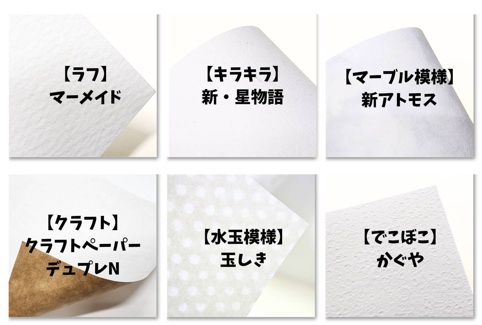 A:一般的な上質紙から、ケント紙、凹凸やキラキラの加工が入った特殊紙など入れております。