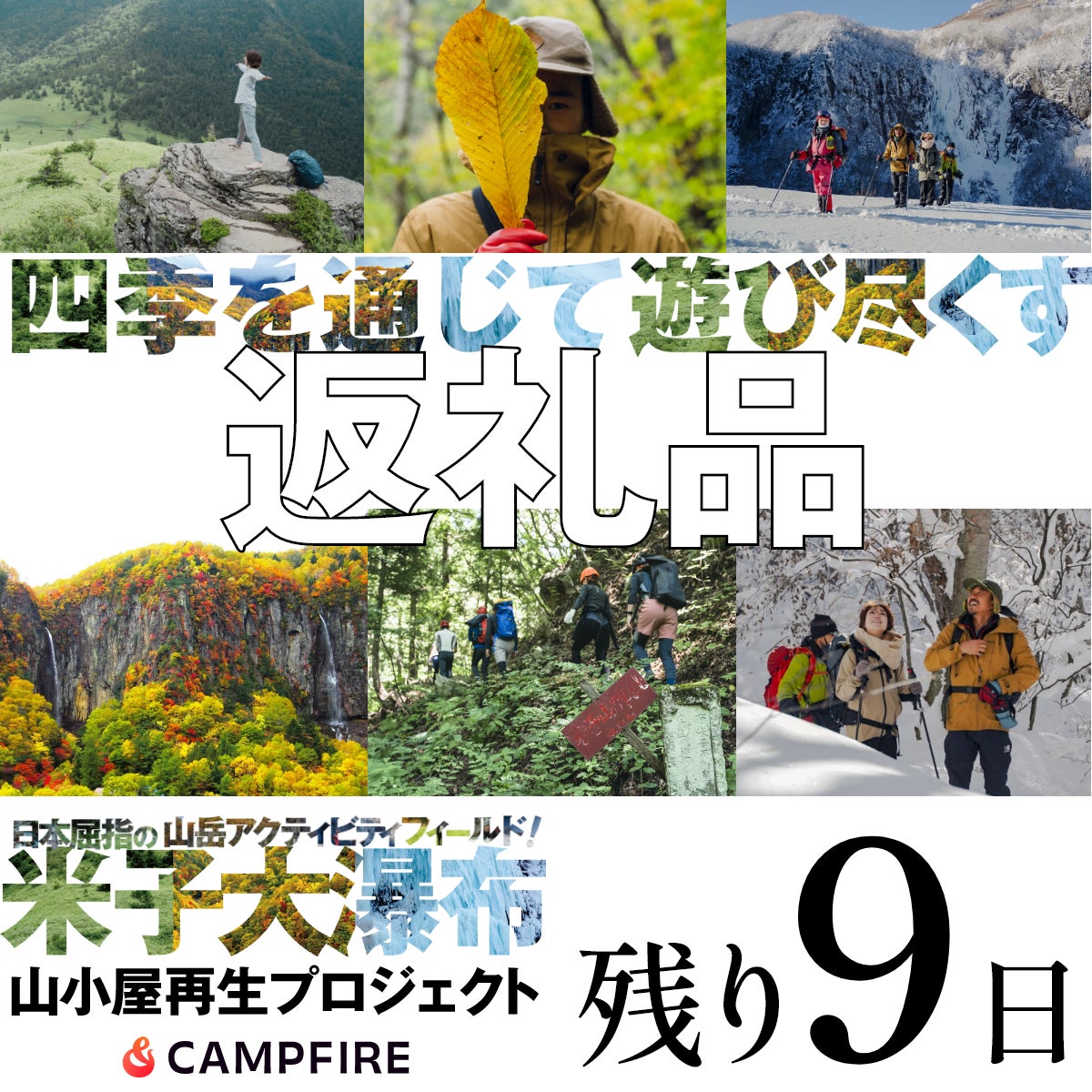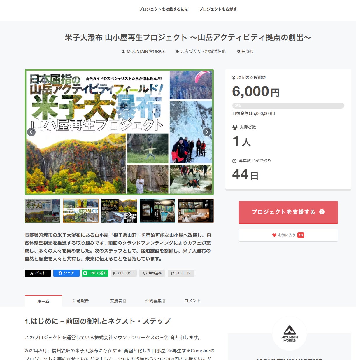 根子岳山荘クラウドファンディング、目標の30%達成!高い目標を立ててしまいましたが、皆さんのご支援でここまで来れました!あと1日、少しでも多くの方に米子大瀑布と根子岳山荘のことを知っていただければと思います。https://camp-fire.jp/projects/786378/view三木正夫市長、長野県須坂市長を6期にわたり御勤めになっています。とても気さくでフレンドリーでそれでいて猛烈に勉強熱心でおられます。常にメモをかかさず、どうやったら公平かつ多くの人が幸せになれるかを考えていらっしゃいます。須坂市の発展のために米子大瀑布を盛り上げようと関係者に声をかけてくれ、いつもスムーズに物事をすすめさせていただき、本当にありがたいです。丸山和也先生、私が若い頃に鞄持ちをしていた関係でいつも私の事業を気にかけてくれています。とにかく水が好きな先生で海や川や滝があれば夏だろうが、冬だろうが飛び込みます。私の滝に憧れる原点なのかもしれません。。米子大瀑布にも何度も足を運んでいただき、滝行や寒中水泳を通してアクティブシニアを体現されています。堀江貴文ことホリエモン、辛口コメント、忖度しないキャラやグルメのイメージで大自然の中での活動とは縁が無さそうですが、、実はめちゃくちゃ自然児です。身体はほとんど筋肉、沢に行けば先陣をきって滝を登攀し、アドベンチャーレースでは真っ暗な藪の中にも突っ込んでいきます。須坂市には特別な思い出があるらしく、氷瀑ツアーも来てよかった!と童心に帰って楽しんでおられました。河邉則宏監督、米子大瀑布のプロモーション動画の監督、撮影をしていただいています。多くの自然番組や映画の撮影を行っており、撮影に対する姿勢はプロの権化です。写真の監督は不動滝の撮影でもろに飛沫を受けて図らずも滝行をしてしまった楽しい顔です。真水の貴重な米子大瀑布において釜揚蕎麦という新しいメニューも開発した発明家でもあります(笑)北平友哉こと世界のキタヒラ、私と同い年で世界最難クライミングルートに挑戦したり、コミュニティの中心となるべく、登山道具店を開業してしまう熱い男です。冬の間、米子大瀑布の除雪やツアーを手伝ってくれています。人に対しても課題に対してもとても謙虚な姿勢で、根子岳山荘もキタヒラさんのようなキャラでありたいと思います。根子岳山荘はここには書ききれない多くの方の応援、ご支援とお手伝いによって成り立っています。より良い場所を作っていくために今までの皆さんもこれからの皆さんも、今後ともご支援いただければ幸いです!米子大瀑布 山小屋再生プロジェクトクラファン挑戦中! https://camp-fire.jp/projects/786378/view